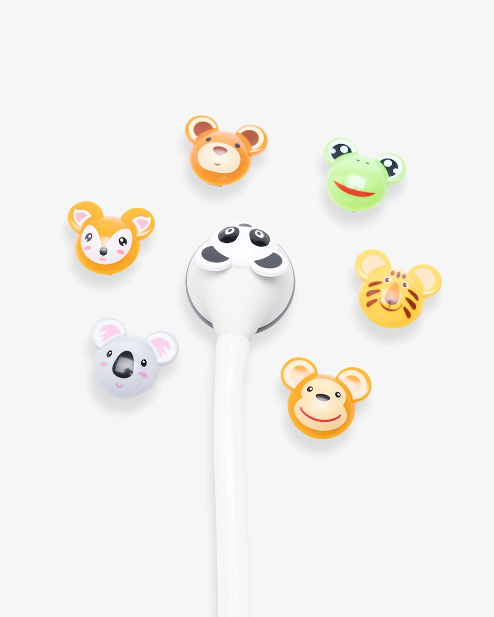 Seitsemän eläintä kiinnitettäväksi rintakappaleeseen: Panda, koala, apina, karhu, sammakko, hirvi ja tiikeri.