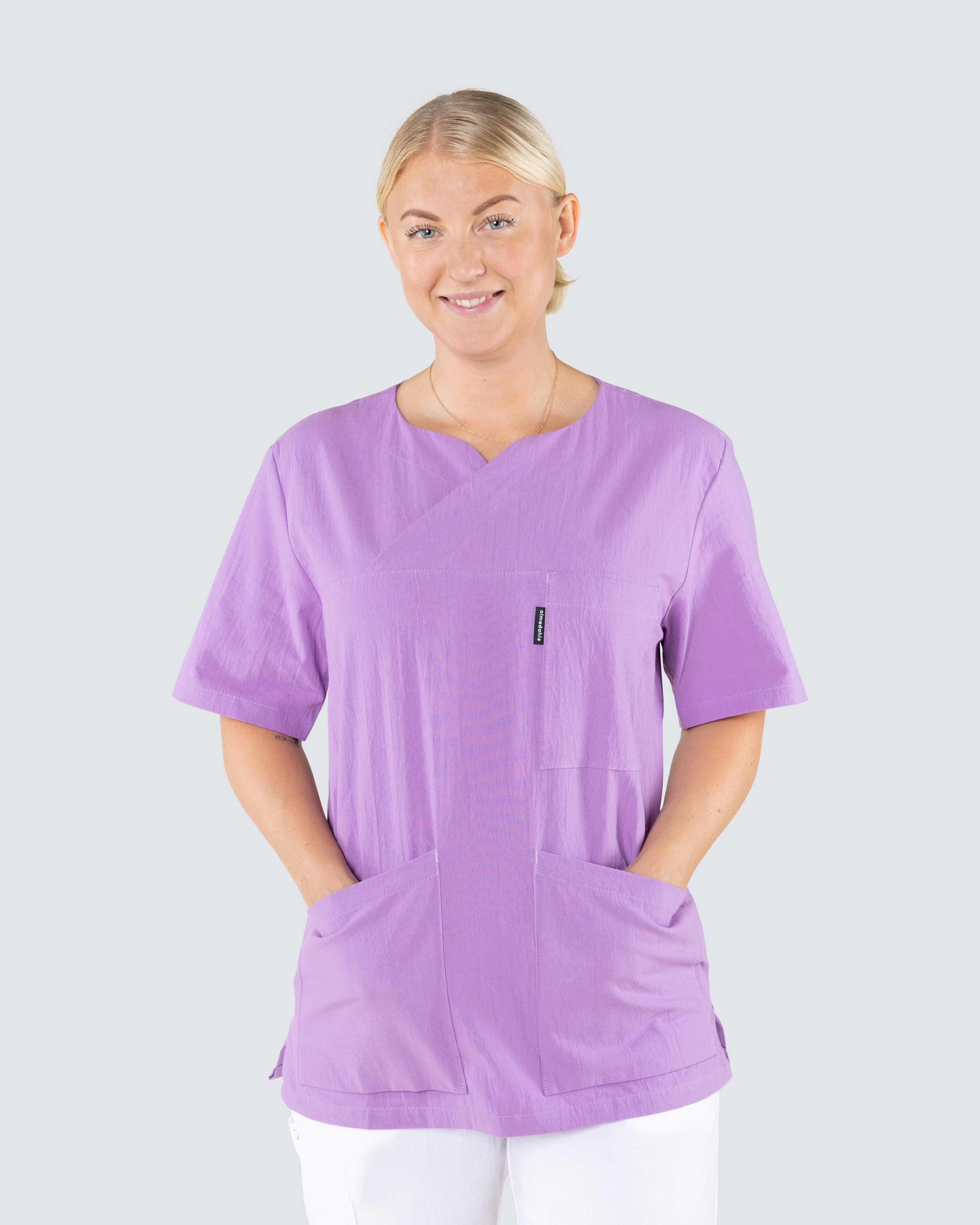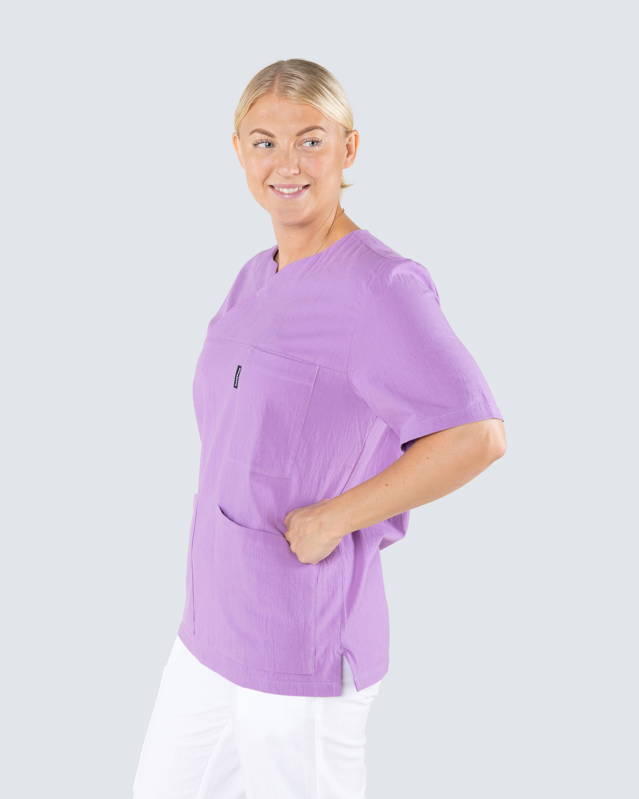 Pusero suorassa unisex-mallissa käytännöllisillä ja tilavilla taskuilla, joissa on runsaasti tilaa työvälineille. Lonkkataskuissa on puhelintasku ja avainreikä, joihin voit helposti kiinnittää avaimia tai henkilökortteja. Puserossa on pyöreä v-pääntie, joka antaa kivan yksityiskohdan. Sivulaskosten ansiosta saat paljon liikkumavaraa. Pusero on valmistettu ryppyisestä puuvillasta, joka antaa viileän ja mukavan tunteen. Ryppyinen kangas vähentää myös huoltotarvetta, kuten silitystä.
