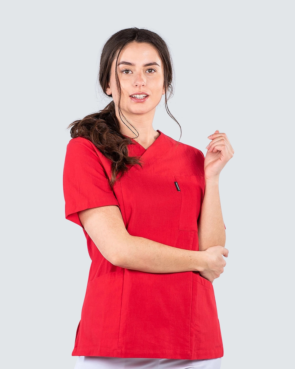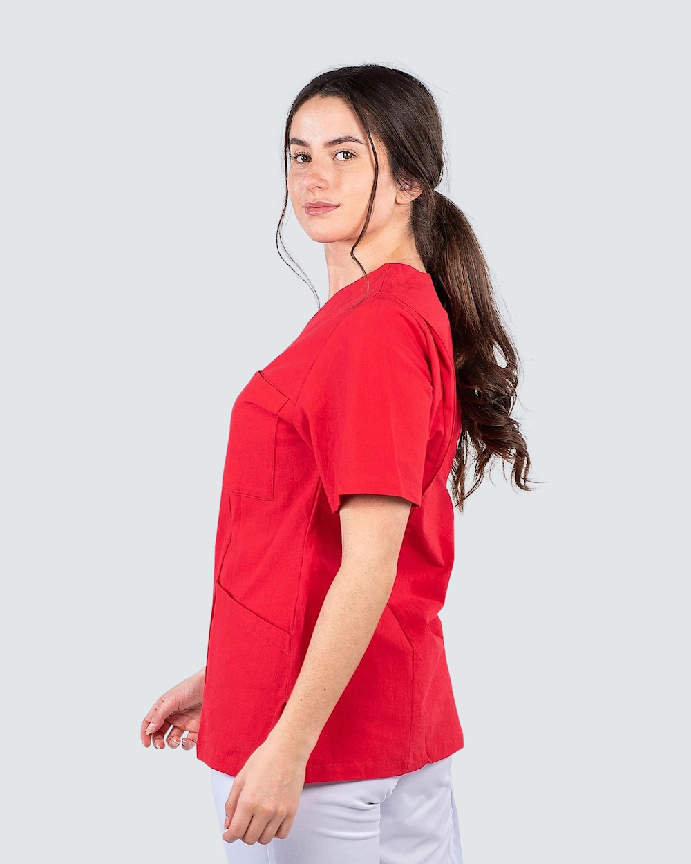 Pusero ryppyisestä puuvillasta, joka antaa kevyen ja viileän tunteen. Ryppyinen puuvilla on helppo hoitaa ja vaatii minimaalista hoitoa, kuten silitystä. Puserossa on v-pääntie ja malli on hieman kaareva, mikä antaa mukavan siluetin ja istuvuuden. Sekä rintataskussa että kahdessa lonkkataskussa on puhelintasku ja avainreikä. Taskujen ansiosta sinulla on runsaasti tilaa erilaisille työvälineille ja tarvikkeille, joita tarvitset työpäivän aikana.