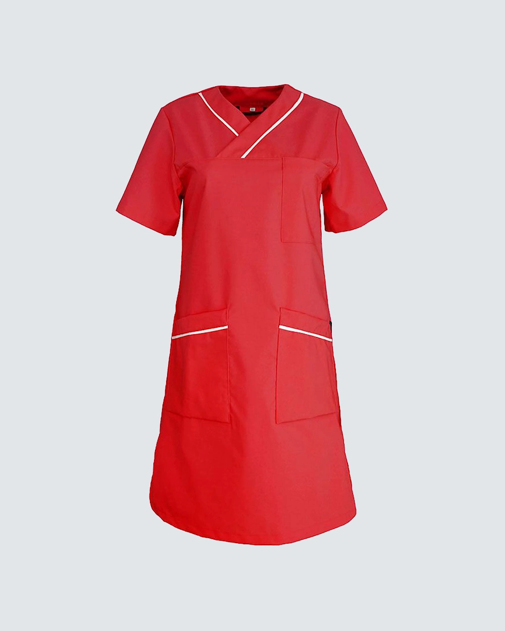 Hienoja yksityiskohtia sisältävä työmekko umpisaumalla kaulan ja taskujen kohdalla. Mekossa on rintatasku ja kaksi tilavaa lonkkataskua. Sivuhalkioiden ansiosta saat mukavan vaatteen, jossa on runsaasti liikkumavaraa.