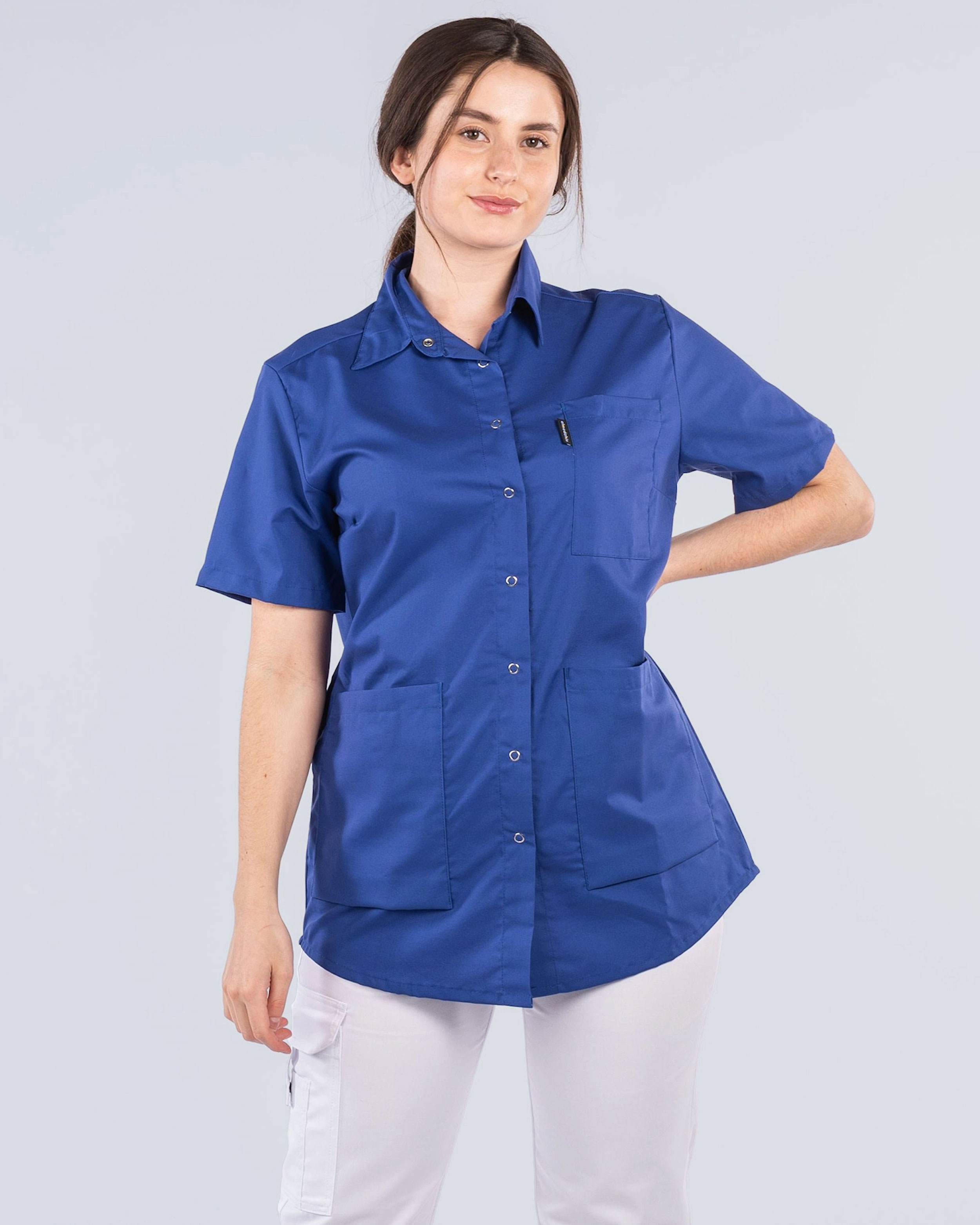 Mukava ja kaunis paita naisten mallissa. Paita on hieman pyöristetty alaosasta, mikä antaa mukavan siluetin. Takana olevat vekit antavat lisää liikkumavaraa ja yhdessä tilavien taskujen kanssa saat mukavan ja käytännöllisen työpaidan. Paidan edessä on kaulus ja painonapit.
