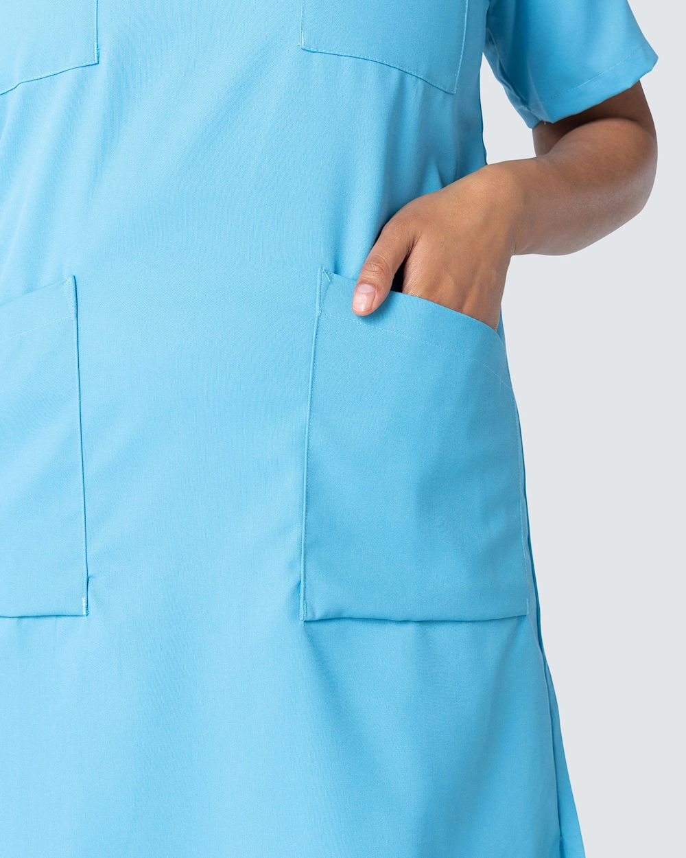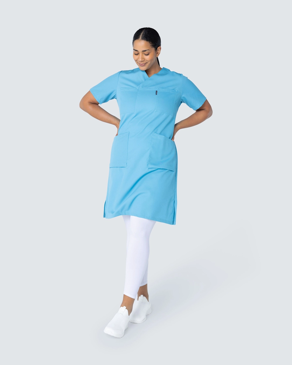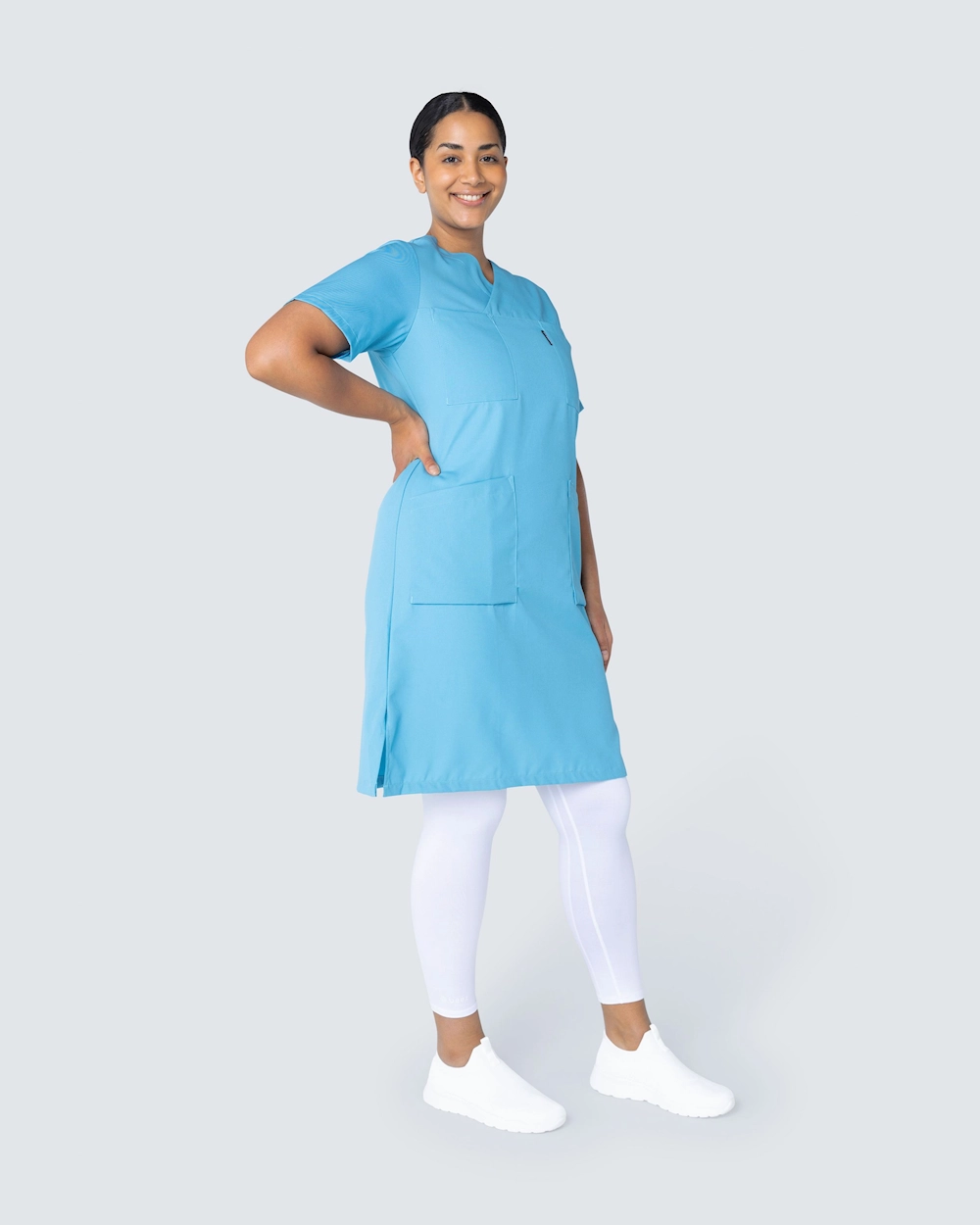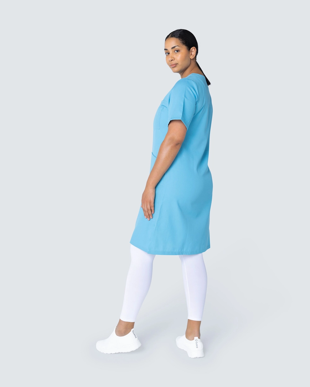 Tämä mukava työmekko on valmistettu ympäristöystävällisestä Tencel-materiaalista, joka antaa viileän ja mukavan tunteen. Mekko on kevyesti kavennettu mukavan istuvuuden ja siluetin saamiseksi. Sivuhalkioiden ansiosta saat mukavan vaatteen ja runsaasti liikkumavaraa. Mekossa on kaksi rintataskua ja kaksi etutaskua, jotka tarjoavat runsaasti tilaa kynille, muistilehtiölle ja erilaisille työvälineille.