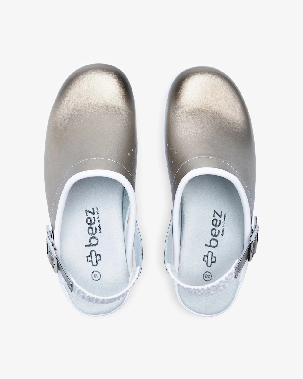 Beez Klassisk -työkenkä sävyssä "Champagne/Metallic" edustaa hienostuneen estetiikan ja ammattimaisen toimivuuden liittoa. Tämä Ruotsissa valmistettu kenkä on erinomainen valinta niille, jotka haluavat työkengän, jossa on elegantti ja lämmin sävy, tinkimättä ergonomiasta ja kestävyydestä.