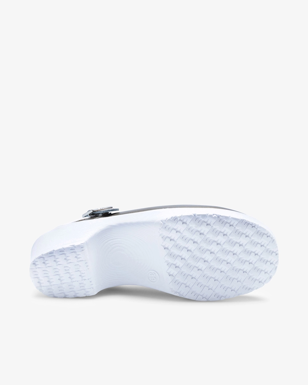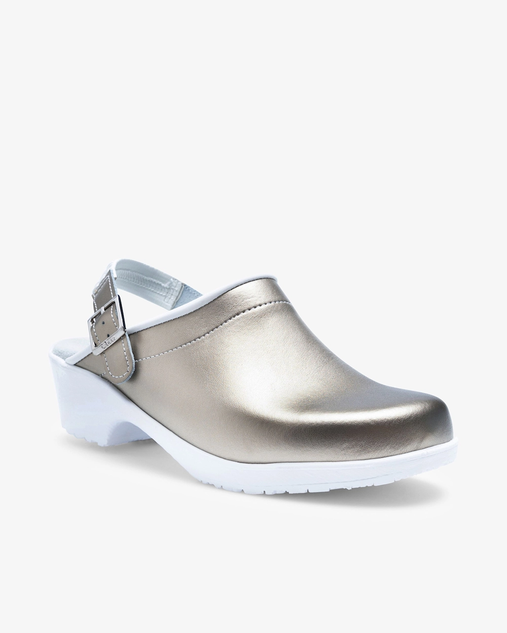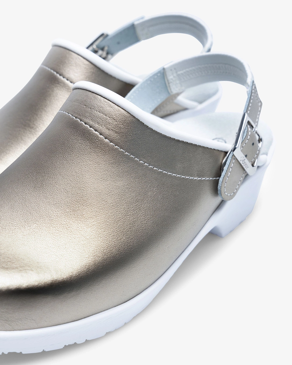 Elegantti muotoilu kohtaa toiminnallisen asiantuntemuksen Kengän aito nahkapäällinen takaa pehmeän ja mukavan istuvuuden. Siinä on erikoiskäsitelty pinta, jossa on hienovarainen, samppanjanvärinen metallinen hohto, joka luo hienostuneen vaikutelman. Pinta on suojattu PU-kerroksella (polyuretaani), mikä varmistaa, että kenkä on sekä kestävä että helppo pitää puhtaana. Testattu, iskuja vaimentava polyuretaanipohja on suunniteltu tarjoamaan maksimaalisen kevennyksen jaloille, polville ja selälle kovilla alustoilla. Joustavuus ja turvallisuus taataan kääntyvällä kantahihnalla.