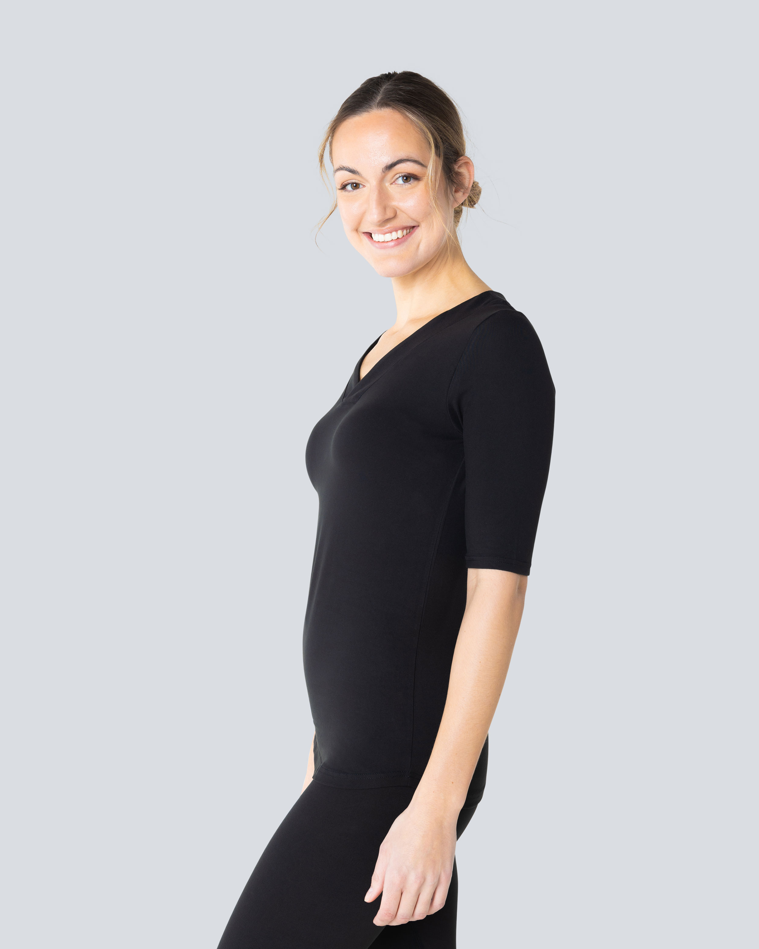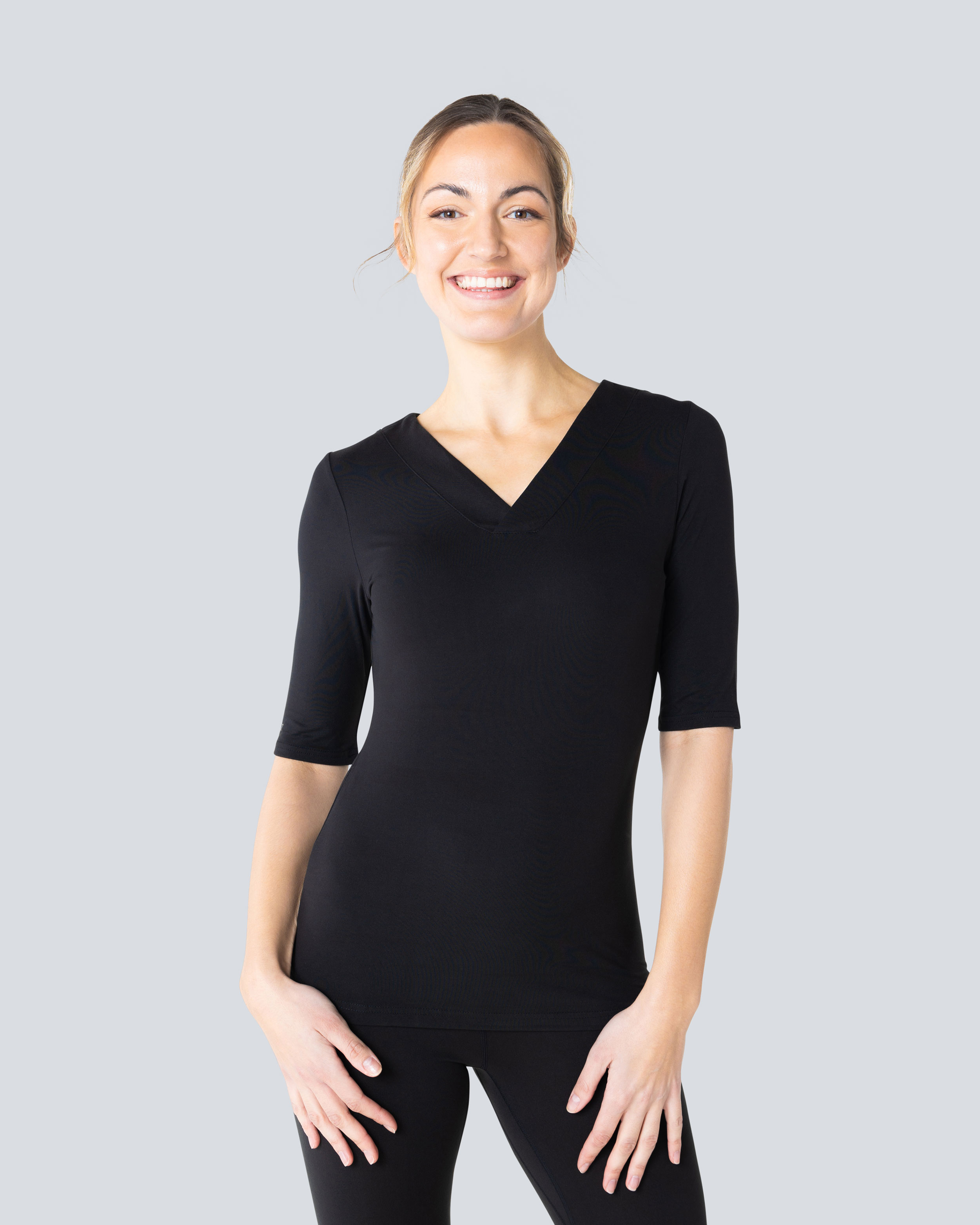 Puolipitkähihainen T-paita vartalonmyötäisellä leikkauksella ja koristeellisella v-aukolla. Valmistettu pehmeästä ja joustavasta materiaalista, joka istuu mukavasti vartaloa vasten, ei hankaavia saumoja tai reunoja. Beez Basics 3/4-hihainen T-paita kuuluu sarjaan mukavia perusvaatteita, jotka kulkevat mukanasi kaikissa arkiaktiviteeteissasi.