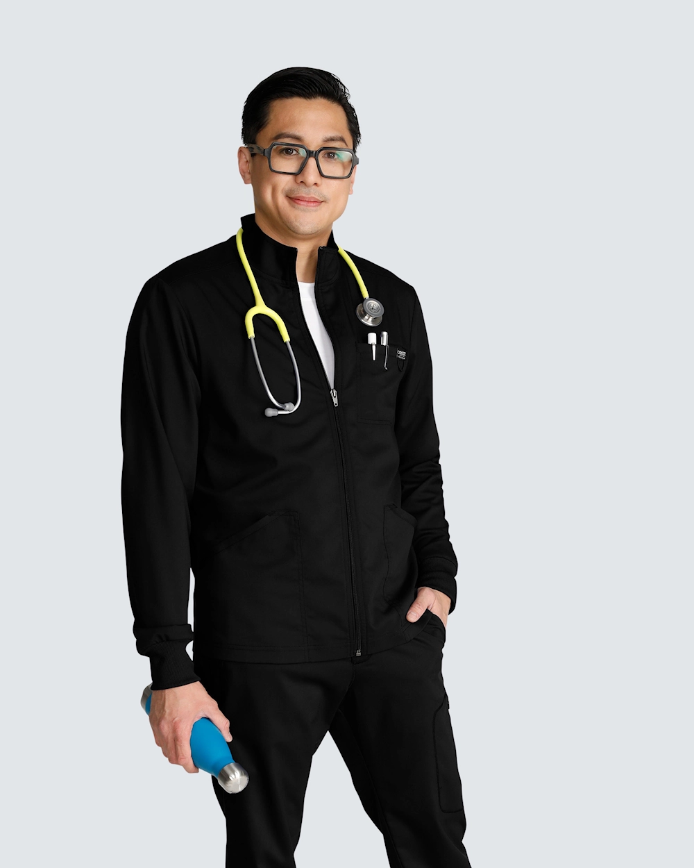 Tässä takissa yhdistyvät toiminnallisuus ja moderni muotoilu, ja se sopii täydellisesti terveydenhuollon ammattilaisille, jotka haluavat sekä mukavuutta että käytännöllisyyttä. Etuvetoketjun ja strategisesti sijoitettujen taskujen, kuten taskutaskun, rintataskun ja matkapuhelintaskujen ansiosta pääset helposti käsiksi varusteisiisi. Takissa on myös hihatasku, jossa on turvavetoketju. Urheilulliset ominaisuudet, kuten logolappu ja joustava benjisilmukka, helpottavat takin ripustamista. Monipuolinen takki, joka sopii sekä työhön että vapaa-aikaan. Sopii sekä naisille että miehille.