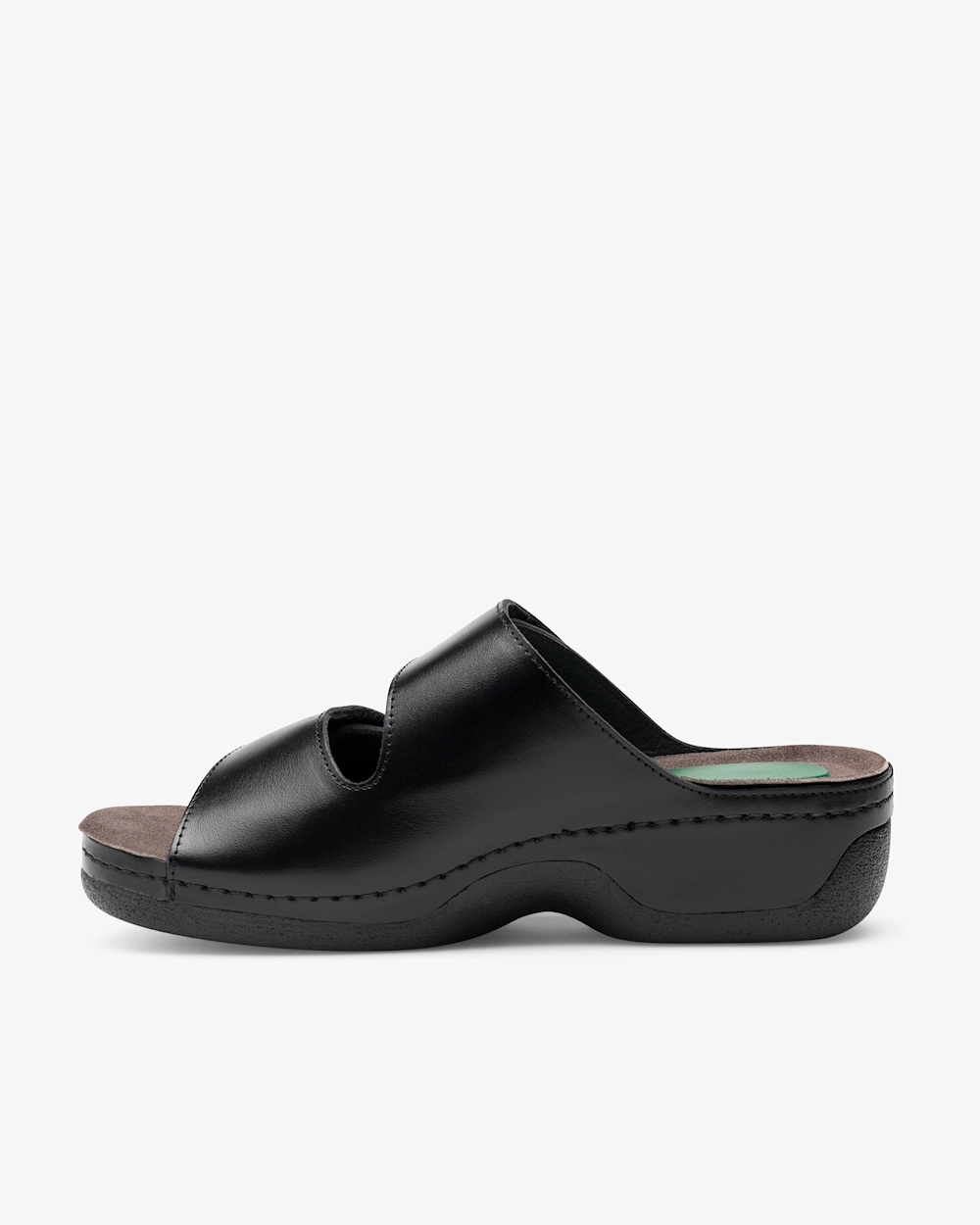 Jalkaystävällinen nahkainen naistensandaali vaihdettavalla, ergonomisella pohjallisella, joka takaa optimaalisen mukavuuden pitkinä työpäivinä. Pohjallisessa on kantapään alla geelityyny, joka tarjoaa ylimääräistä iskunvaimennusta ja lievittää kipua. Kaksi tarranauhalla säädettävää remmiä ja tyylikäs koriste toisessa remmissä. Tässä sandaalissa on kumiseoksesta valmistettu ulkopohja, joka tarjoaa hyvän pidon ja sopii näin sekä sisä- että ulkokäyttöön.