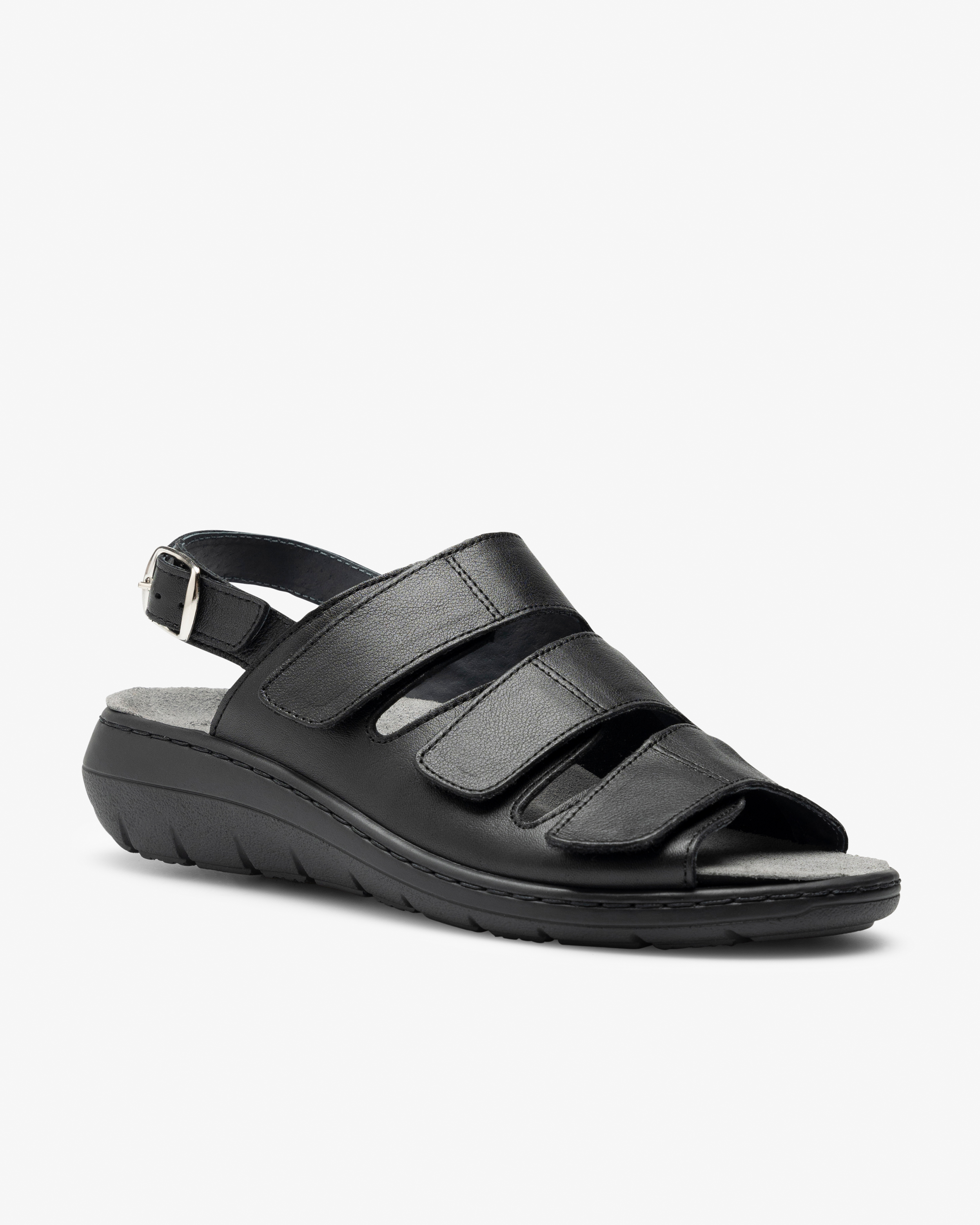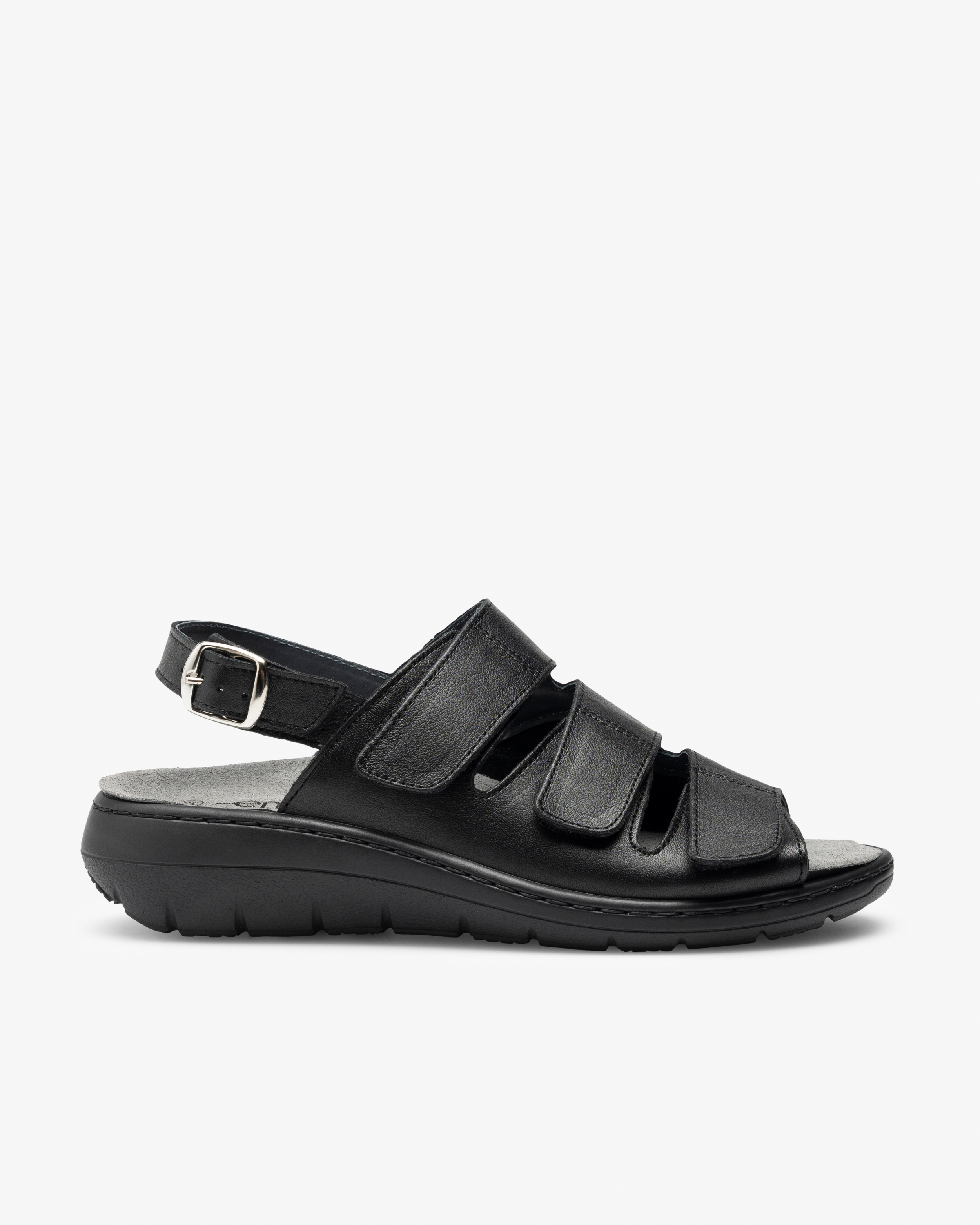Jalkaystävällinen naistensandaali pehmeästä nahasta vakauttavalla, säädettävällä kantapäähihnalla sekä kolmella tarranauhalla säädettävällä remmillä. Sandaalin sisäpuolella on joustavaa materiaalia, joka tarjoaa lisämukavuutta esimerkiksi niille, jotka kärsivät vaivaisenluusta. Sandaali soveltuu sekä ulko- että sisäkäyttöön.