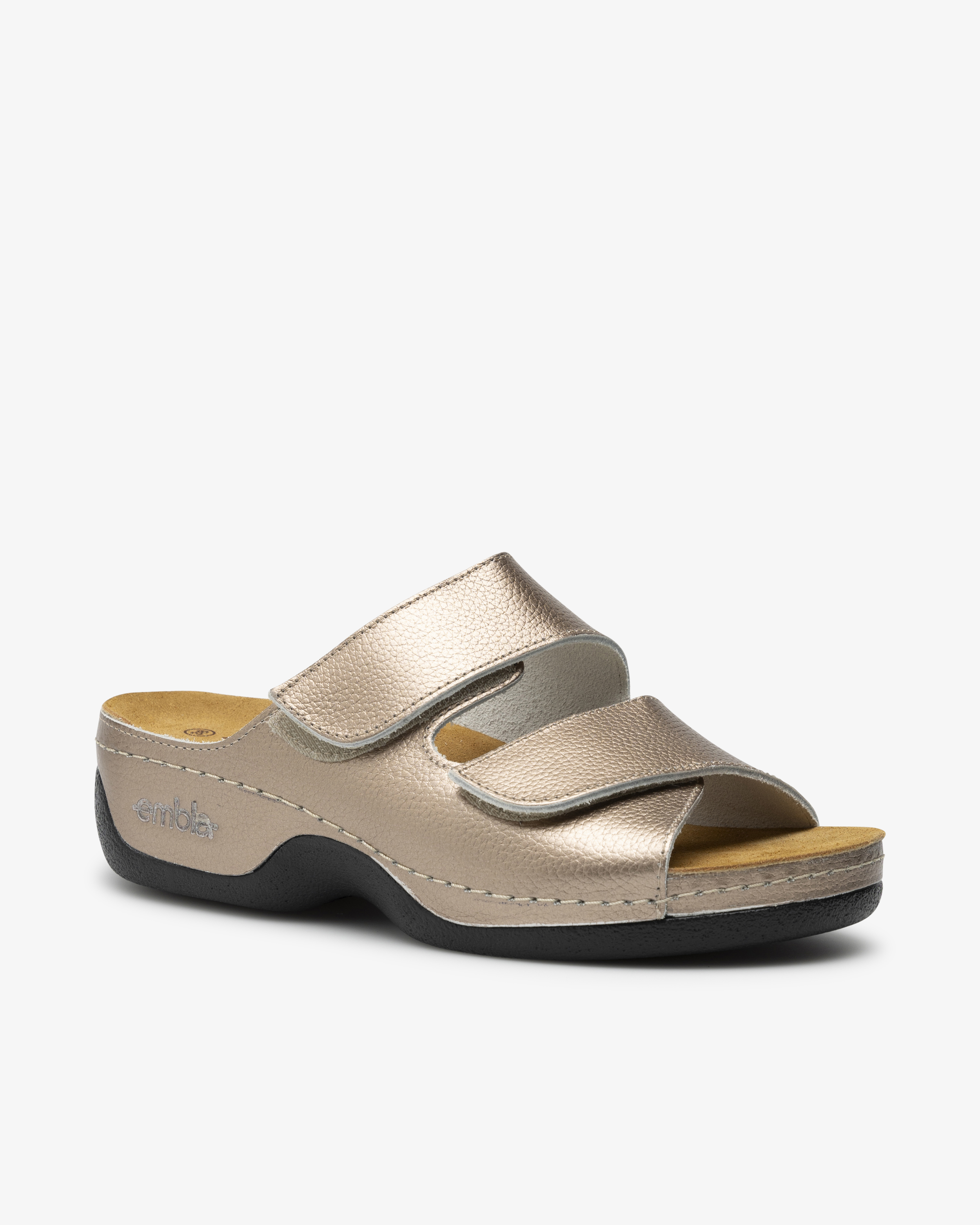 Tuo työpäivääsi silaus tyyliä näillä hienostuneilla nahkasandaaleilla. Ergonominen sisäpohja tarjoaa erinomaisen mukavuuden, ja siinä on holvikaarituki sekä etujalkaterän kaarta nostava tyyny, joka edistää jalkaterän hyvää asentoa koko päivän ajan. Kaksi säädettävää hihnaa mahdollistavat täydellisen istuvuuden jokaiselle jalalle. Ihanteelliset pitkiin työvuoroihin ja kaikille, jotka haluavat ilmaista henkilökohtaista tyyliään tinkimättä toiminnallisuudesta.