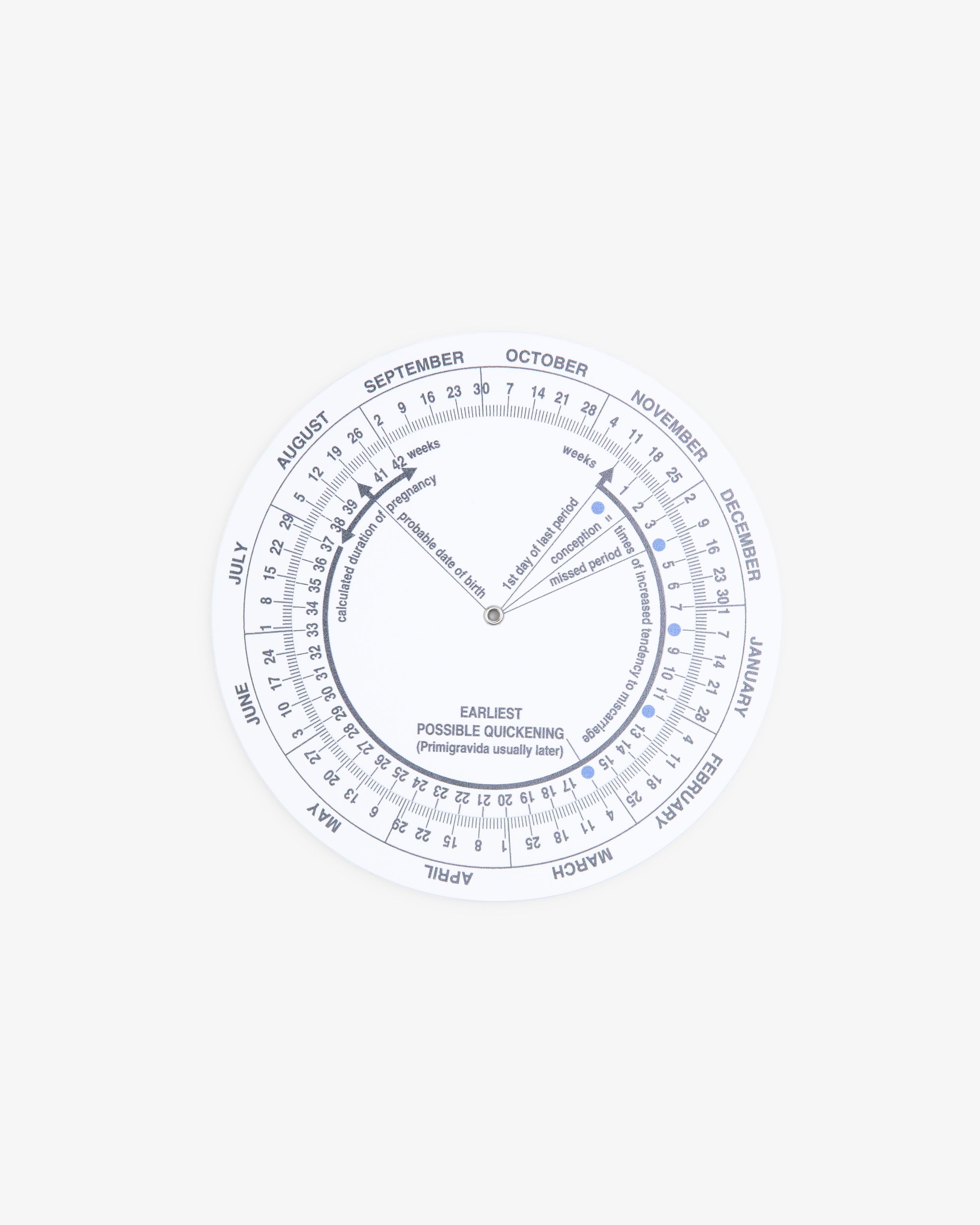 Englanninkielinen raskauspyörä arvioidun synnytysajan laskemiseksi. Pyörä koostuu kahdesta erikokoisesta pyörivästä levystä, ja sitä voi käyttää myös lääkityksen arviointiin.