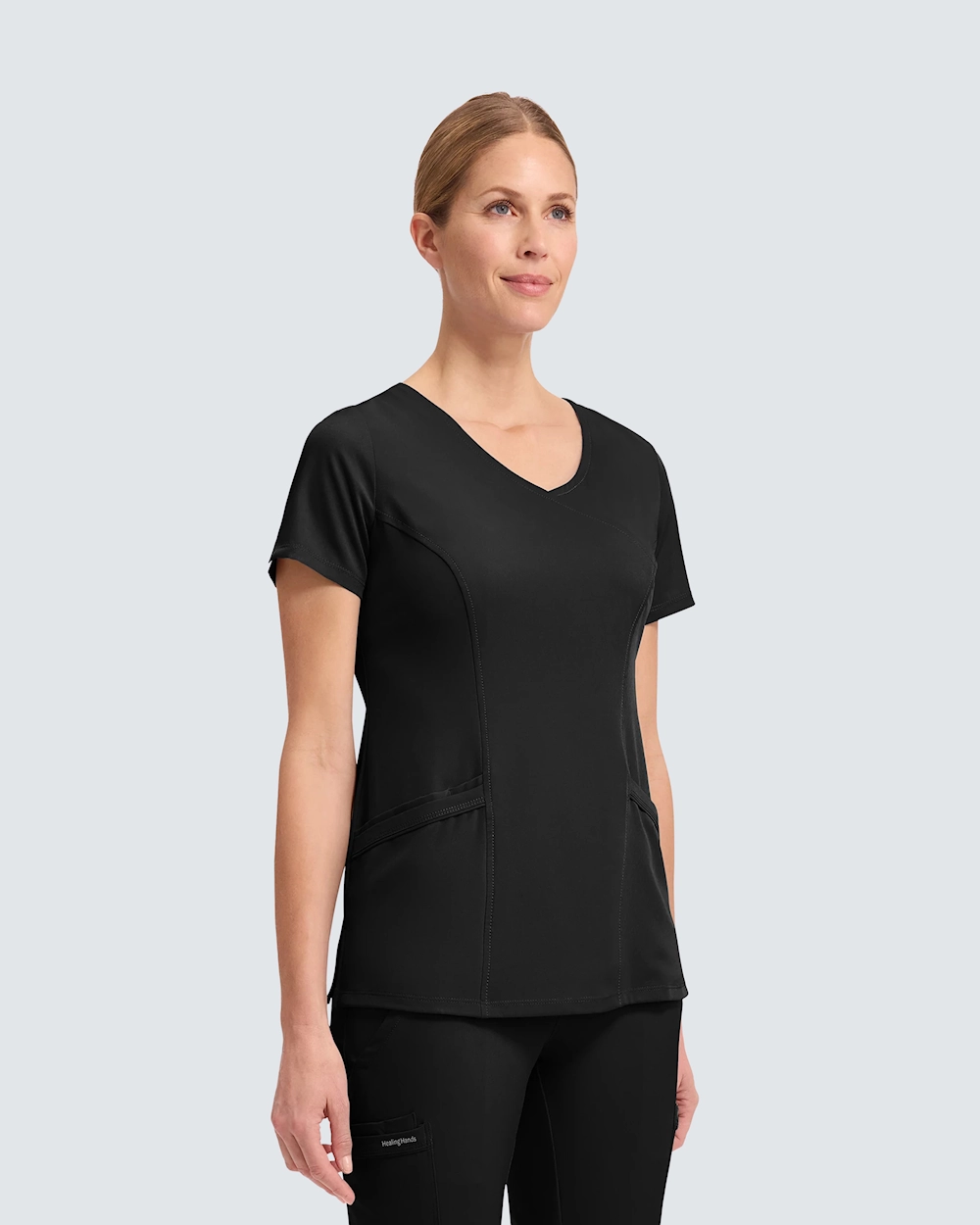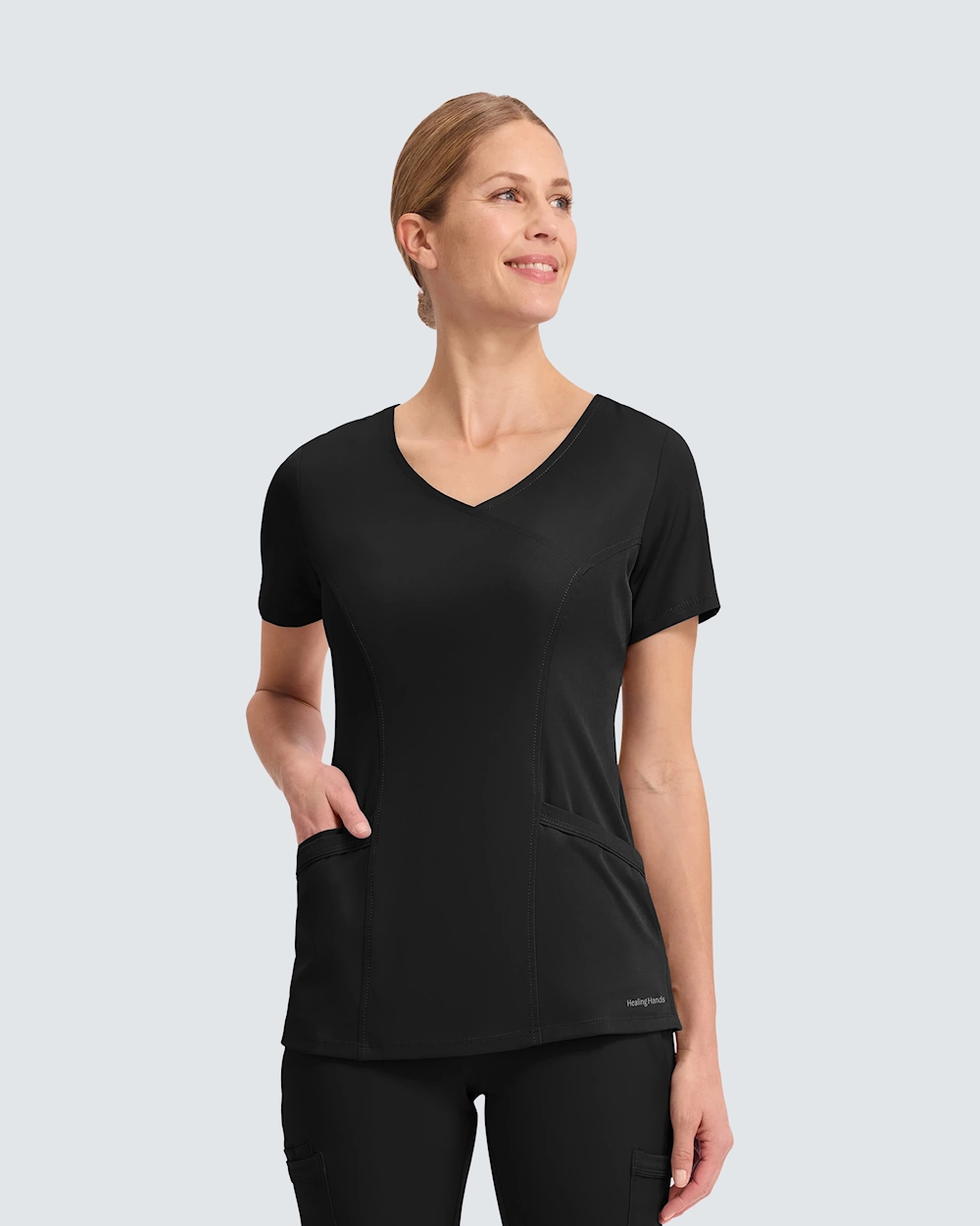 Healing Handsin Madison-yläosa on suunniteltu antamaan mukavan ja ammattimaisen tunteen koko työpivän ajaksi. Mallissa on moderni kietaisutyyli (mock-wrap) ja prinsessaleikkaukset sekä edessä että takana, jotka luovat selkeän ja vartalonmyötäisen istuvuuden.