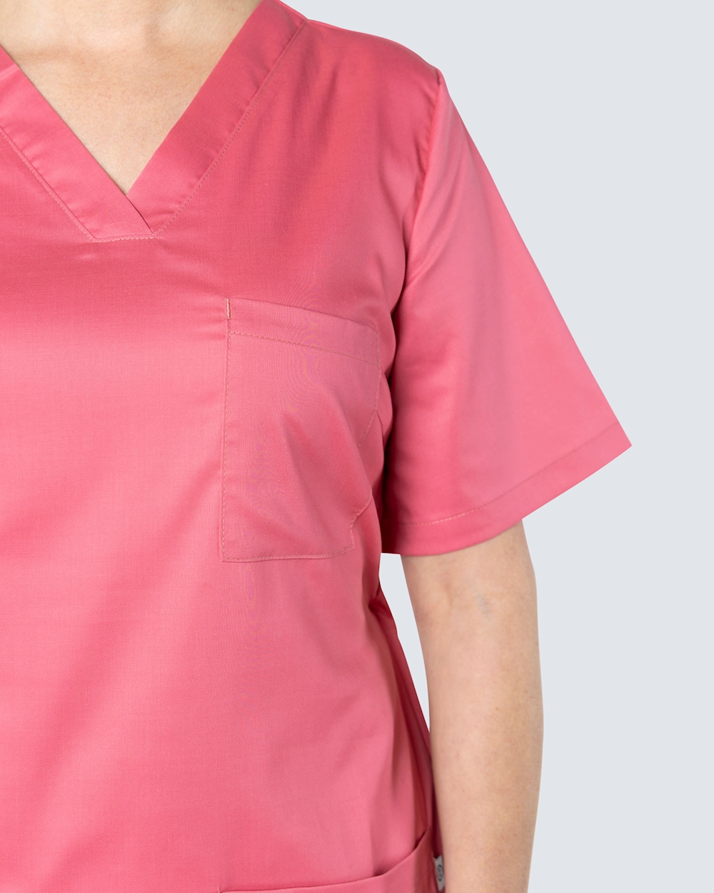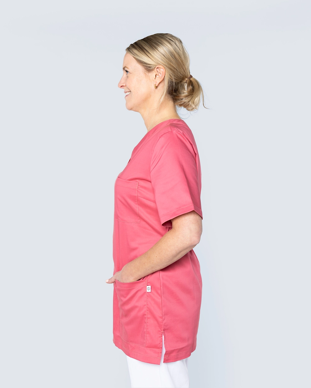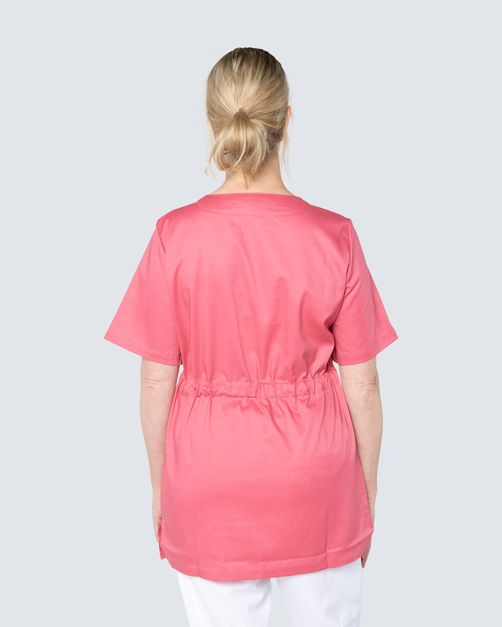 Hieman tyköistuva naisten tunikan muotoilu yhdistää mukavuuden ja trendikkään tyylin. Pehmeä hieman joustava kangas tarjoaa sekä liikkumisvapautta että mukavaa kiiltoa. Käytännöllisillä sivutaskuilla ja avainrenkaalla varustettu tunika sopii erinomaisesti hoitotyöhön. Sivuhalkiot ja säädettävä vyötärö edistävät ihanteellista liikkumisvapautta.