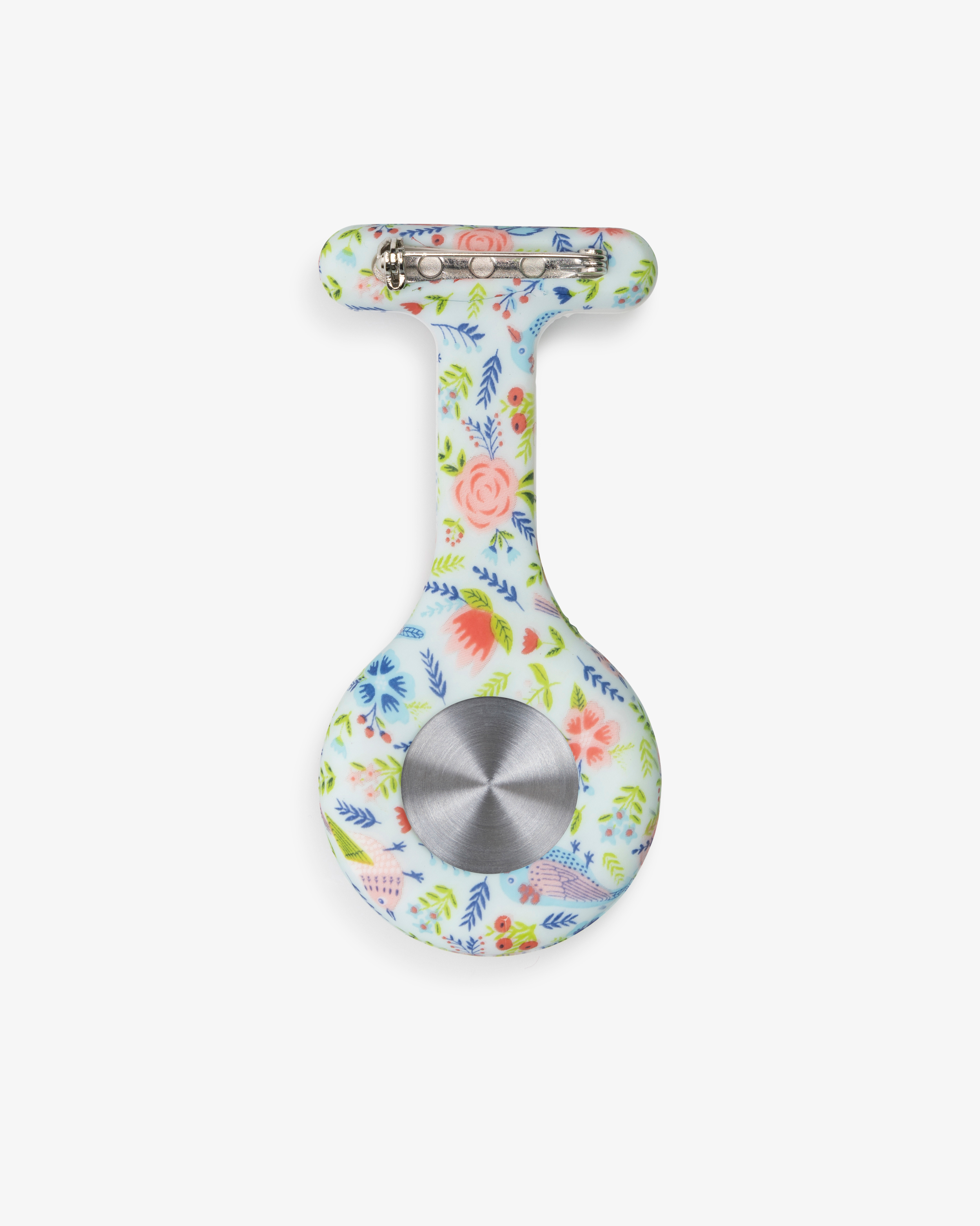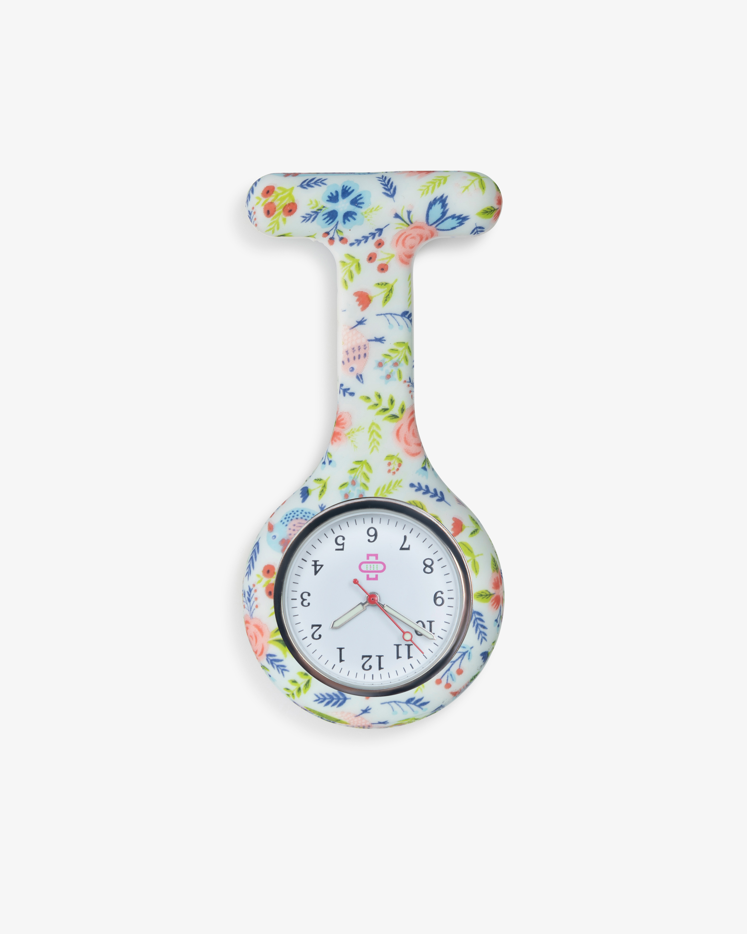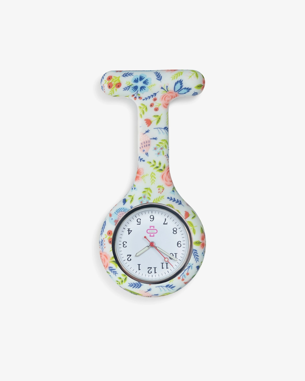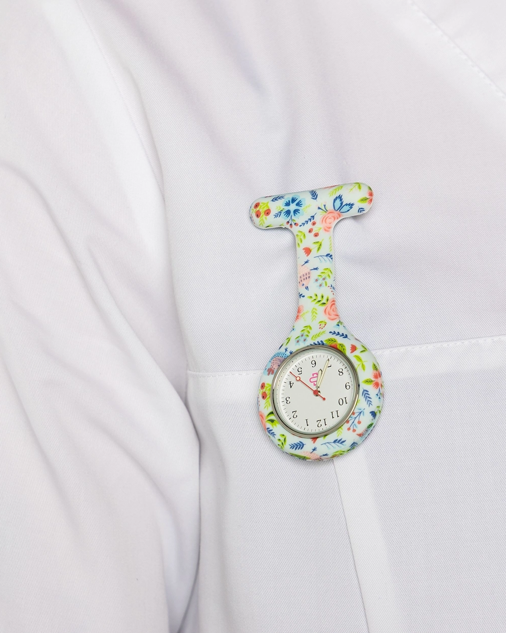 Seuraa trendiä ja lisää raikas mintunvihreä kukkakuosi työasusi ilmeeseen. Tämä kello on käytännöllinen ja tyylikäs valinta hoitohenkilöstölle, joka haluaa yhdistää toiminnallisuuden ja persoonallisuuden.
