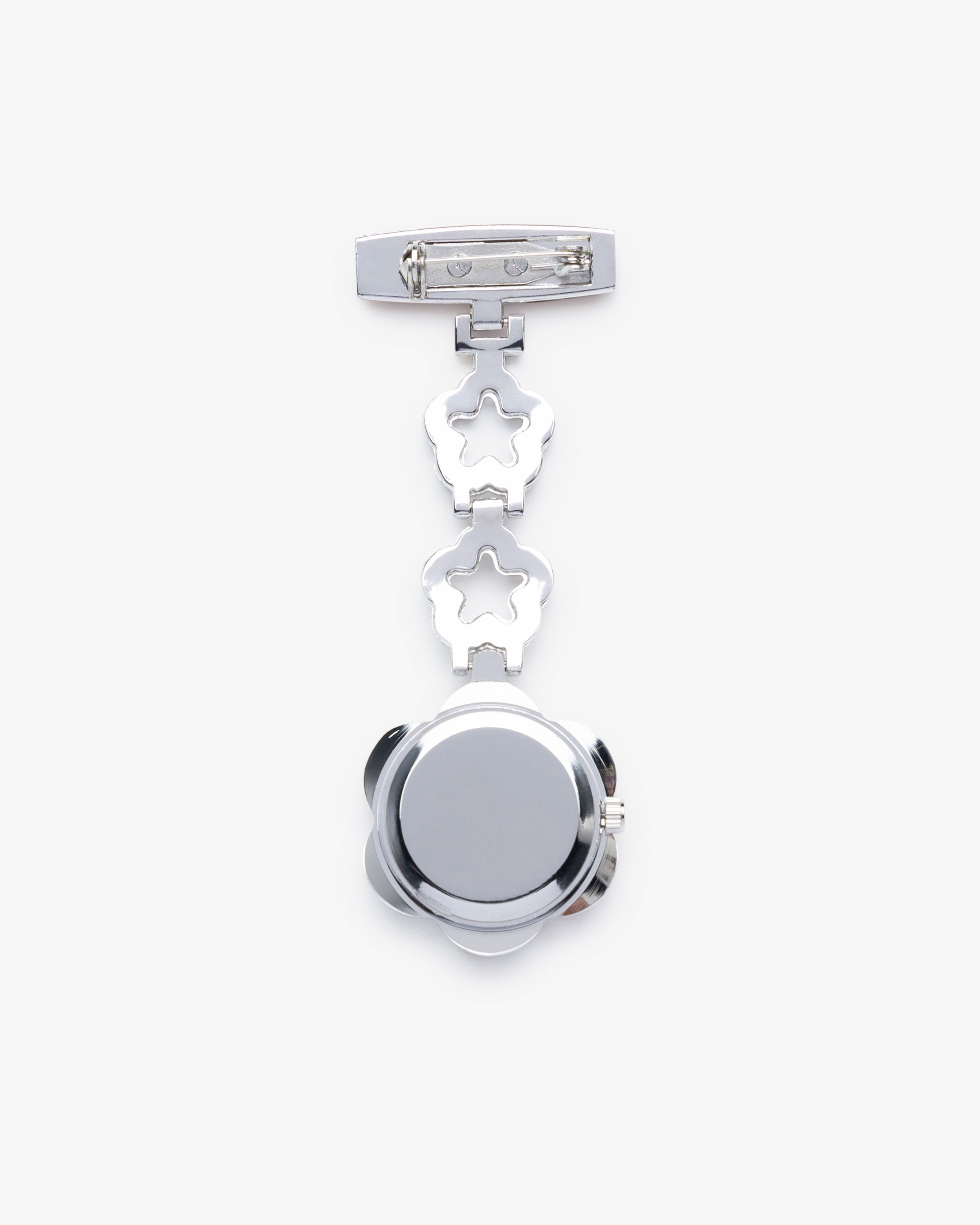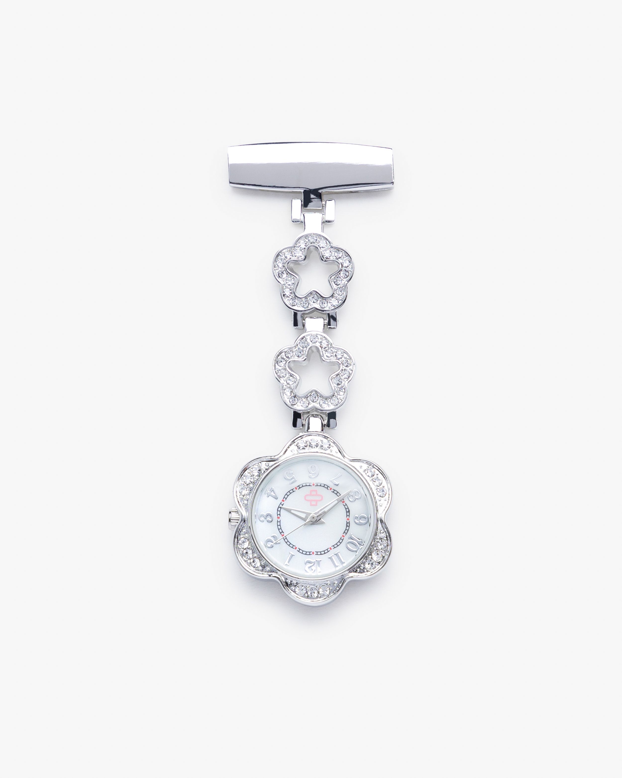 Tämä hoitajan kello sopii erinomaisesti sinulle terveydenhuollossa työskentelevälle, joka ei voi käyttää rannekelloa työvuoron aikana. Kellossa on lenkki ruostumattomasta teräksestä, jossa on kaksi kukkaa ja strassikivien ansiosta saat kauniin korun työpuseroosi. Kello puhdistetaan helposti käsidesillä. Voit kiinnittää hoitajan kellosi tunikaan tai puseroon kätevällä hakaneulakiinnityksellä.