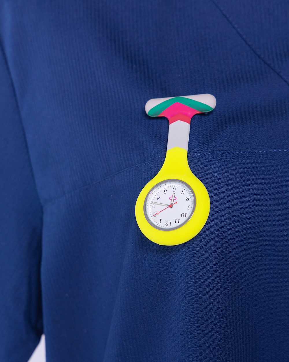 Lisää väriä työvaatteisiisi raidallisella hoitajan kellolla. Tämä kello yhdistää käytännöllisyyden raikkaaseen ja leikkisään designiin, joka sopii täydellisesti työhön, kun haluat sekä tyylikkään että toimivan ratkaisun.