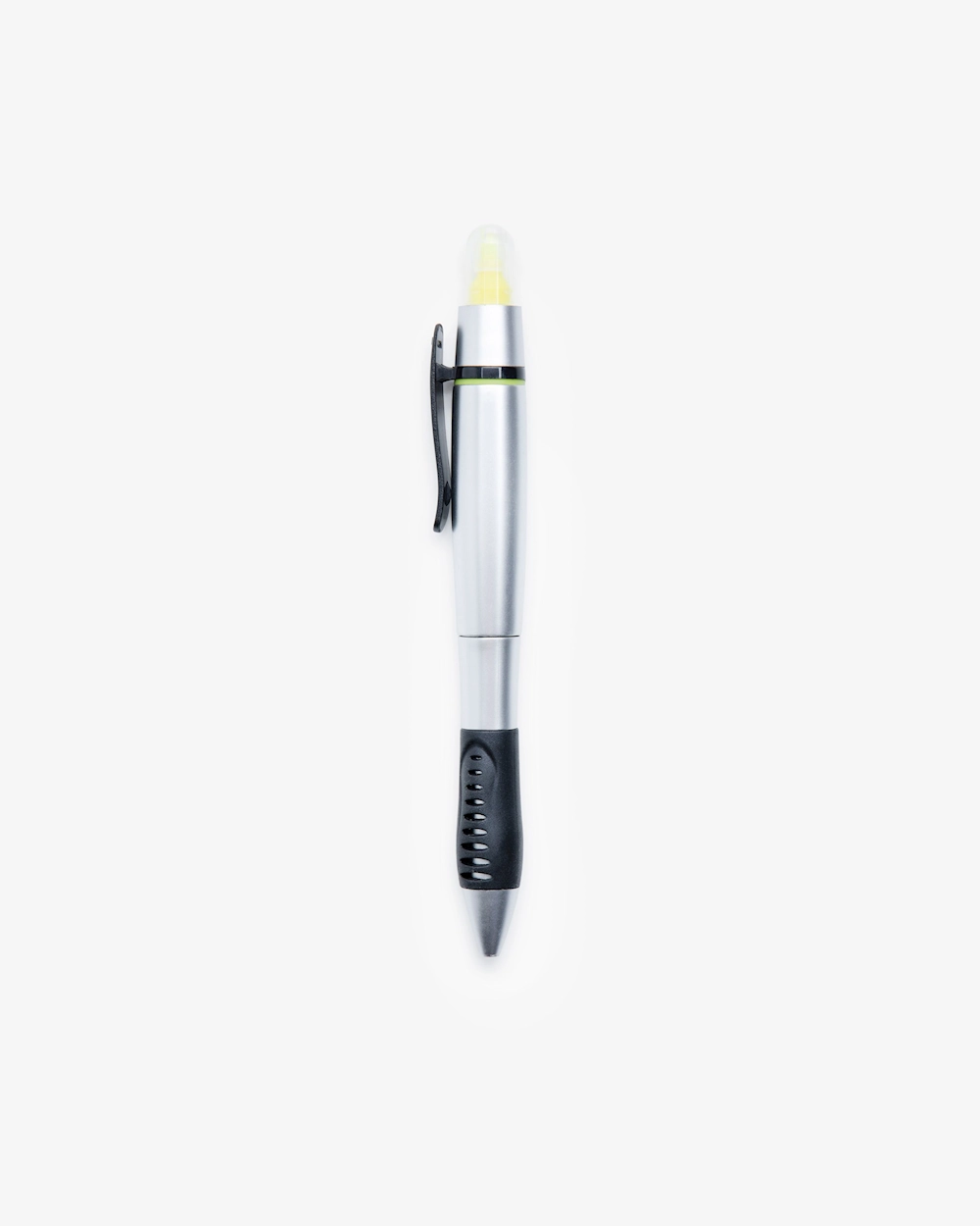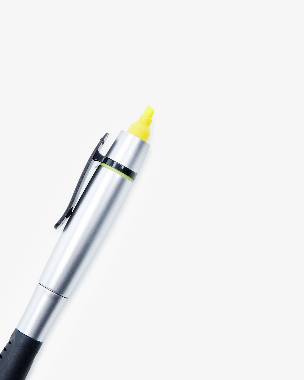 Käytännöllinen 2-in-1 kynä. Toisessa päässä on mustaa mustetta ja korostuskynän päässä keltainen väri.