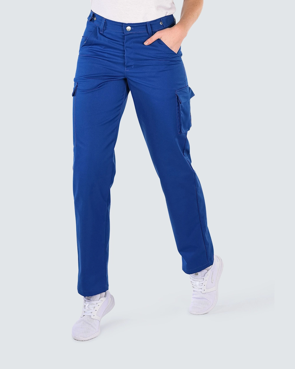 Miellyttävät työhousut, joissa kuminauha ja vyötäröresori. Housut ovat vahvempaa kangasta käytännöllisillä ja tilavilla taskuilla.