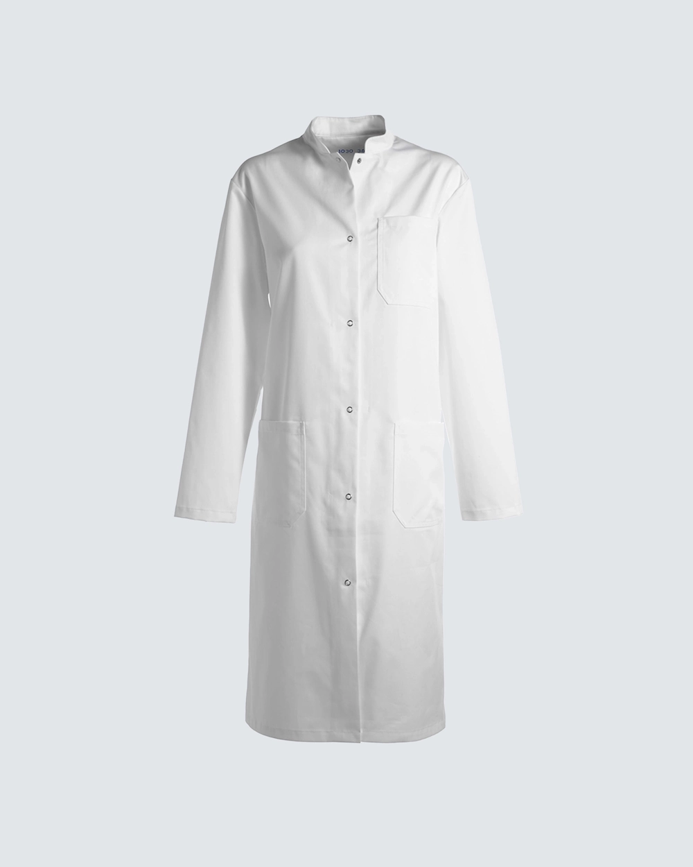 Klassinen laboratoriotakki koristeellisella kiinakauluksella. Hameessa on joustava vyötärönauha, joka tarjoaa mukavan istuvuuden.