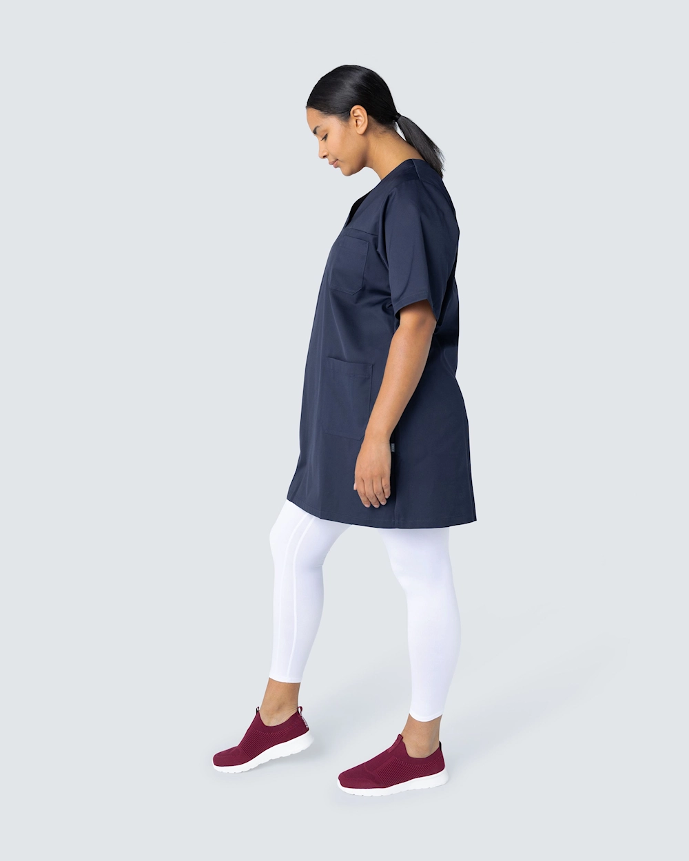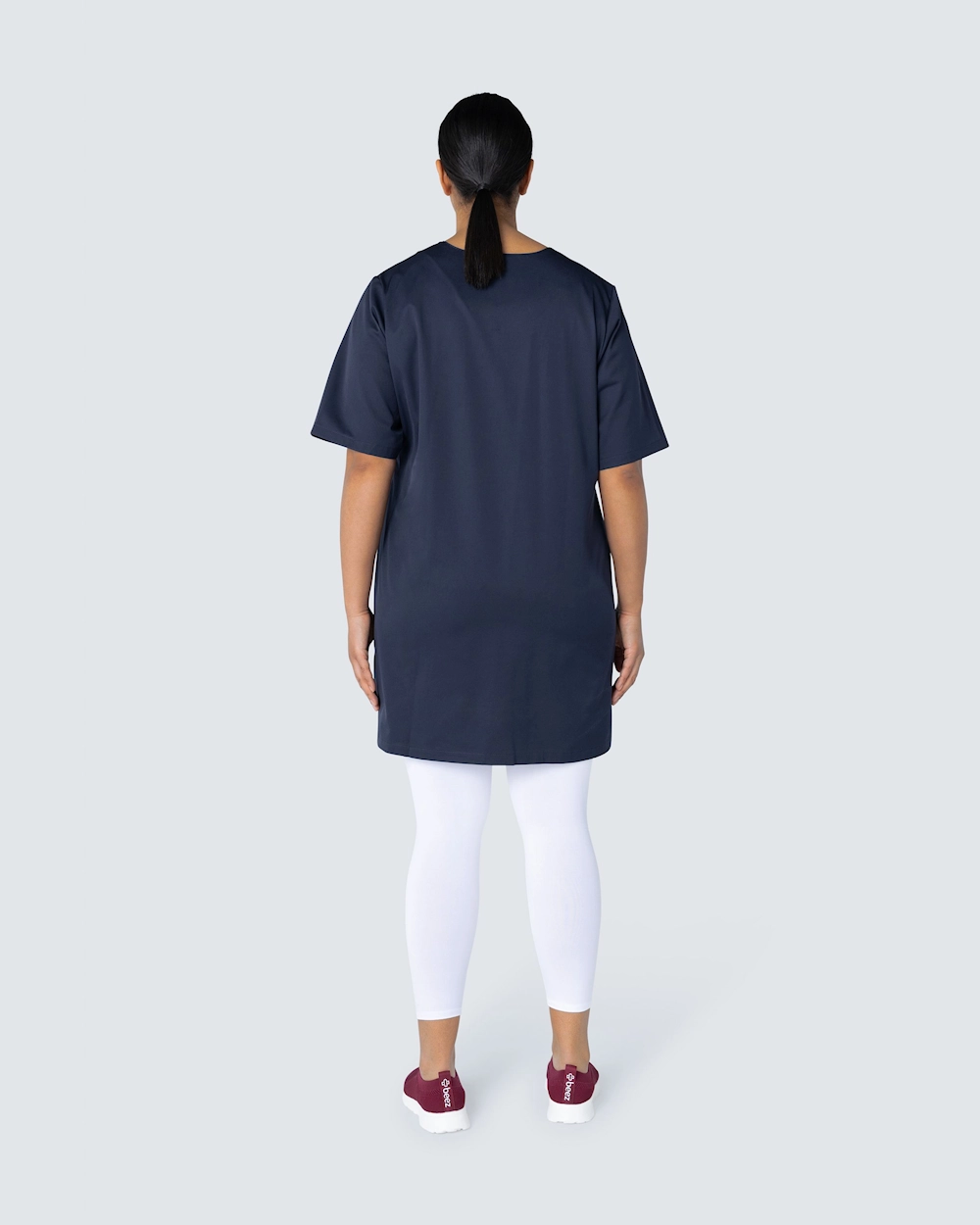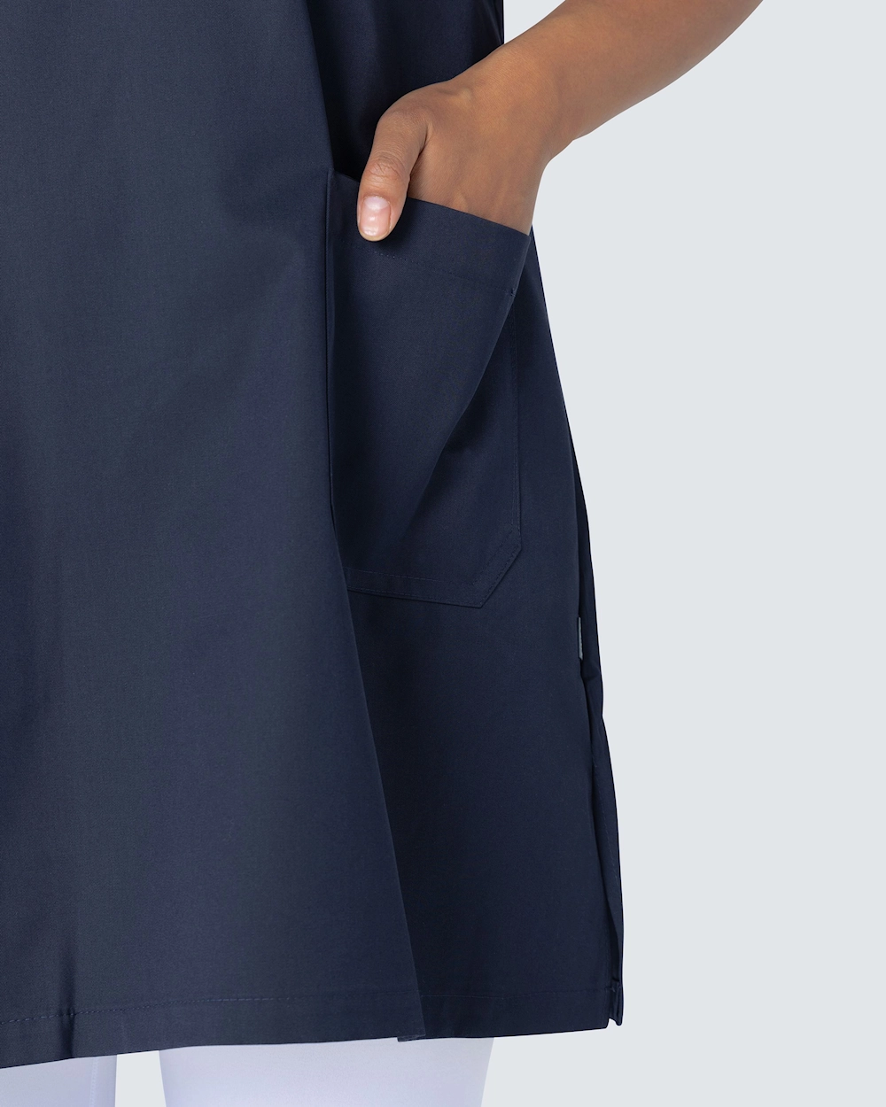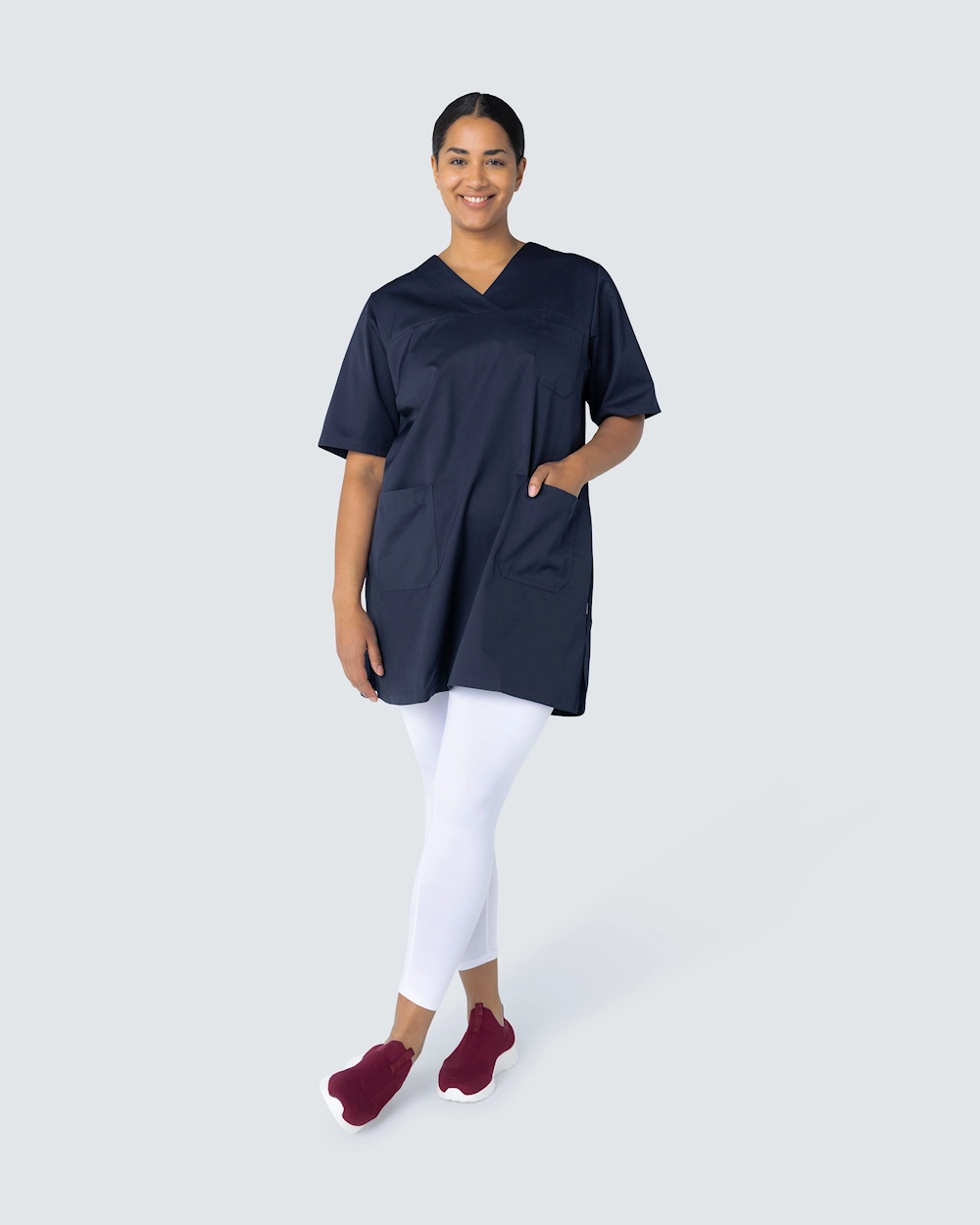 Tässä hoitomekossa on v-pääntie ja kevyt kavennus täydellisen istuvuuden saavuttamiseksi. Mekko ulottuu hieman polven yläpuolelle ja sopii hyvin sekä työhousujen että leggingsien kanssa.