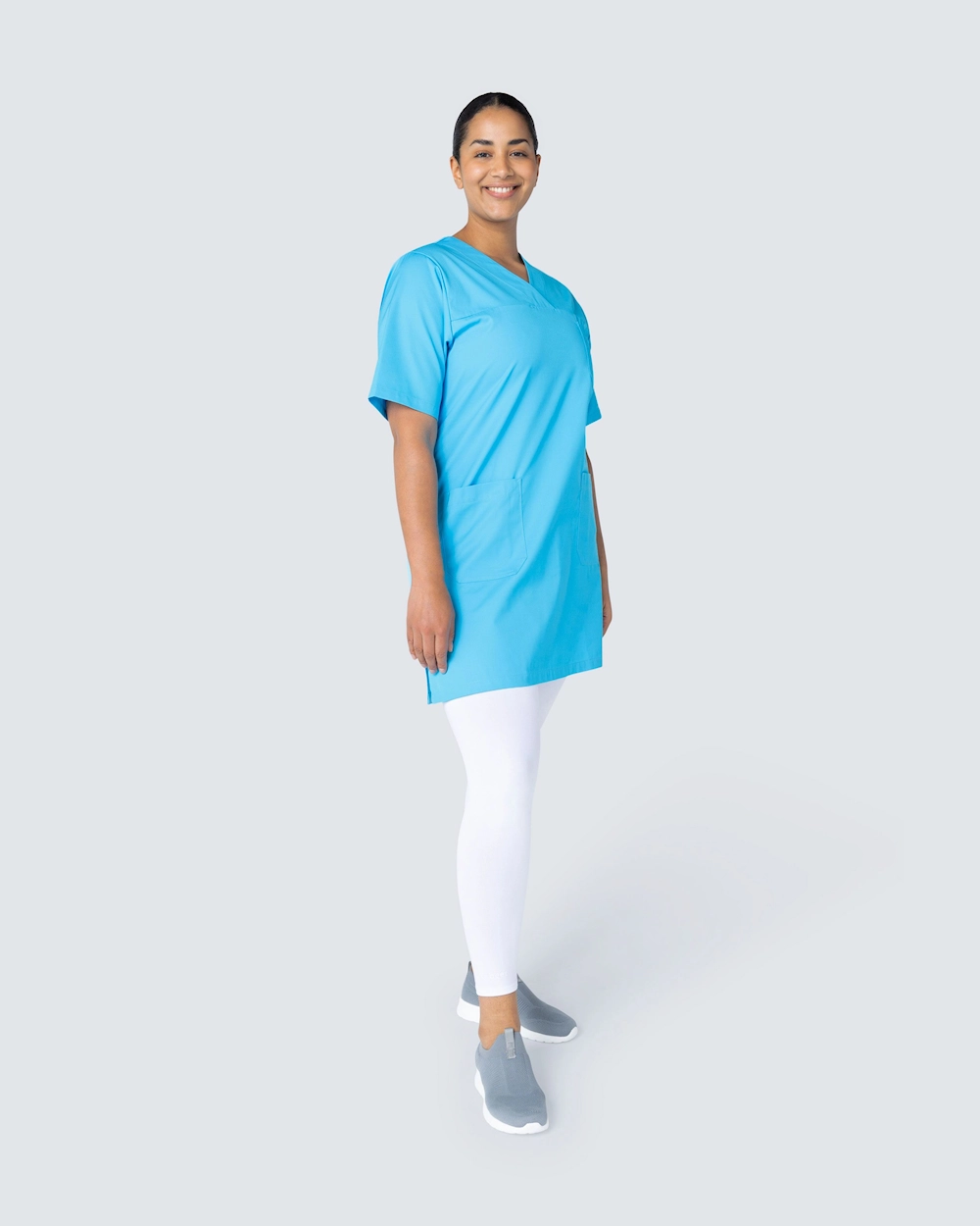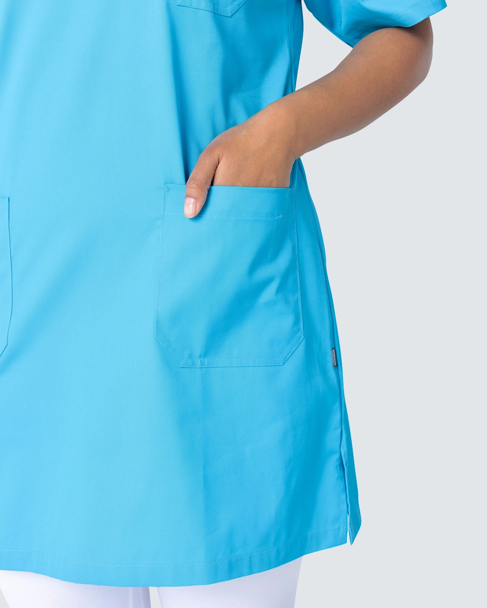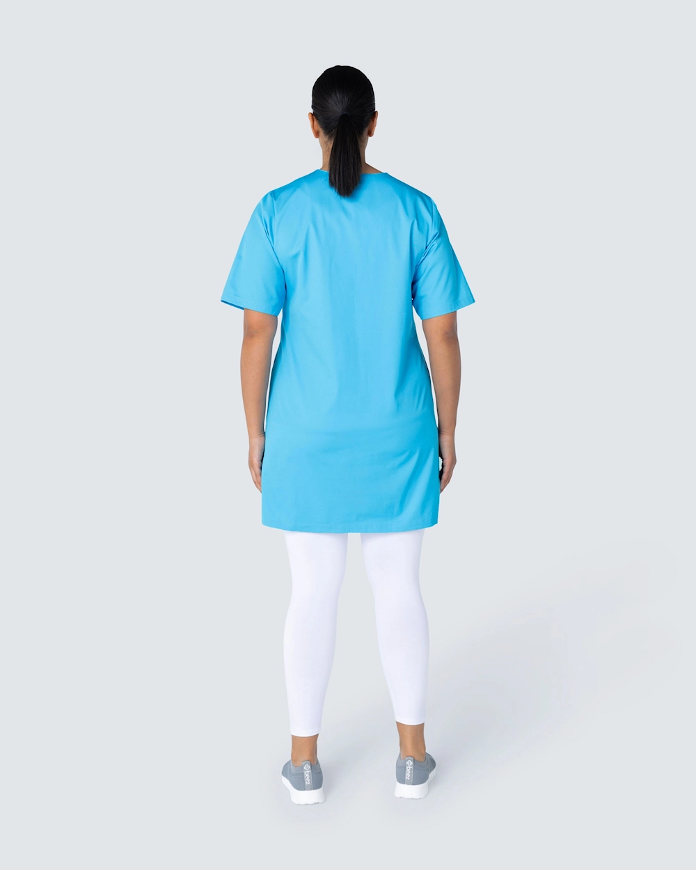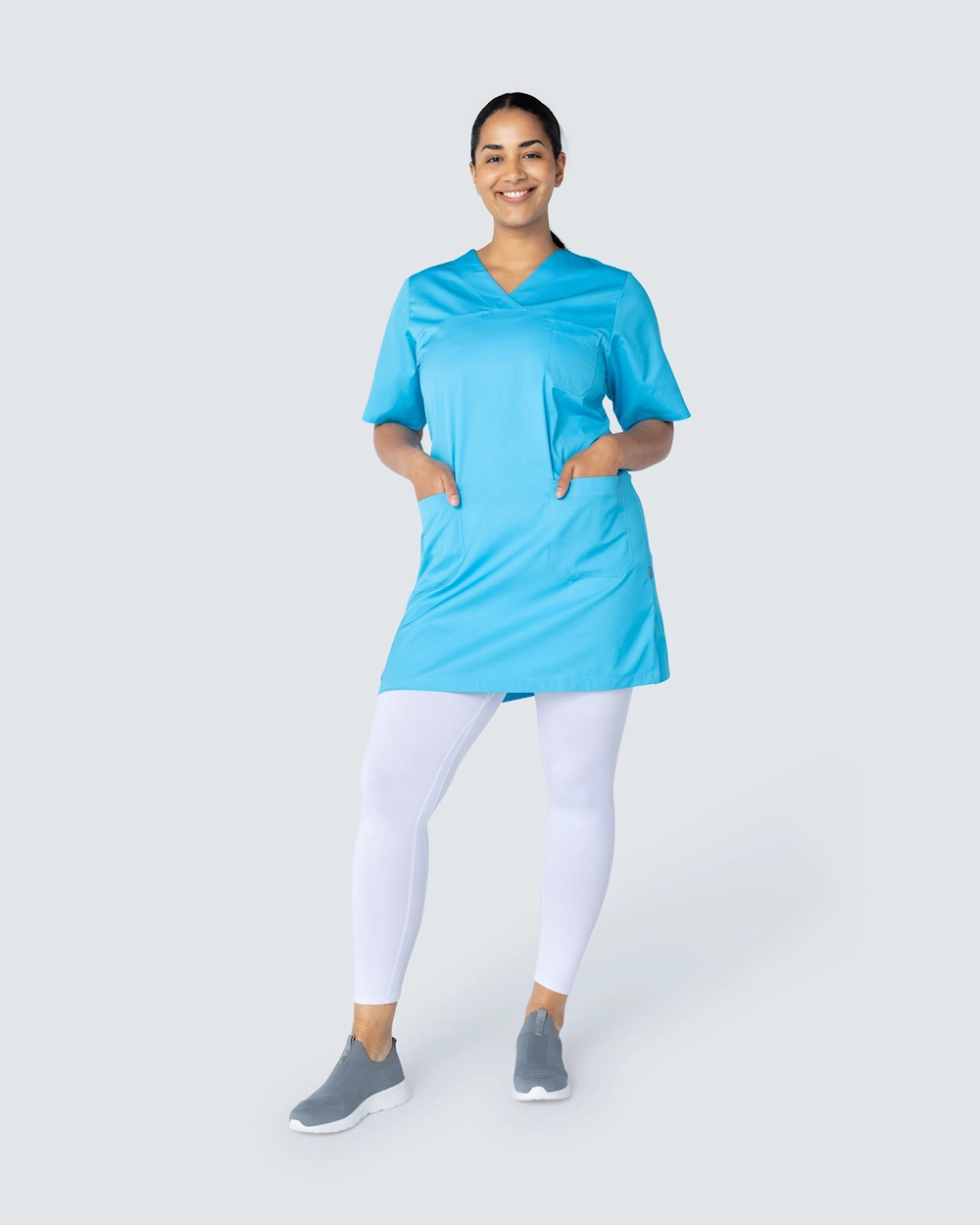 Tässä hoitomekossa on v-pääntie ja kevyt kavennus täydellisen istuvuuden saavuttamiseksi. Mekko ulottuu hieman polven yläpuolelle ja sopii hyvin sekä työhousujen että leggingsien kanssa.