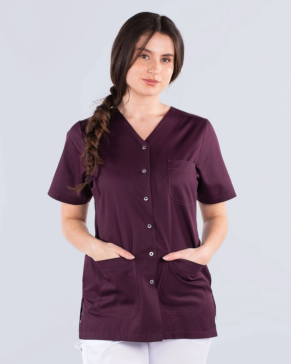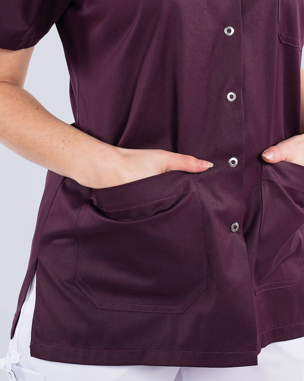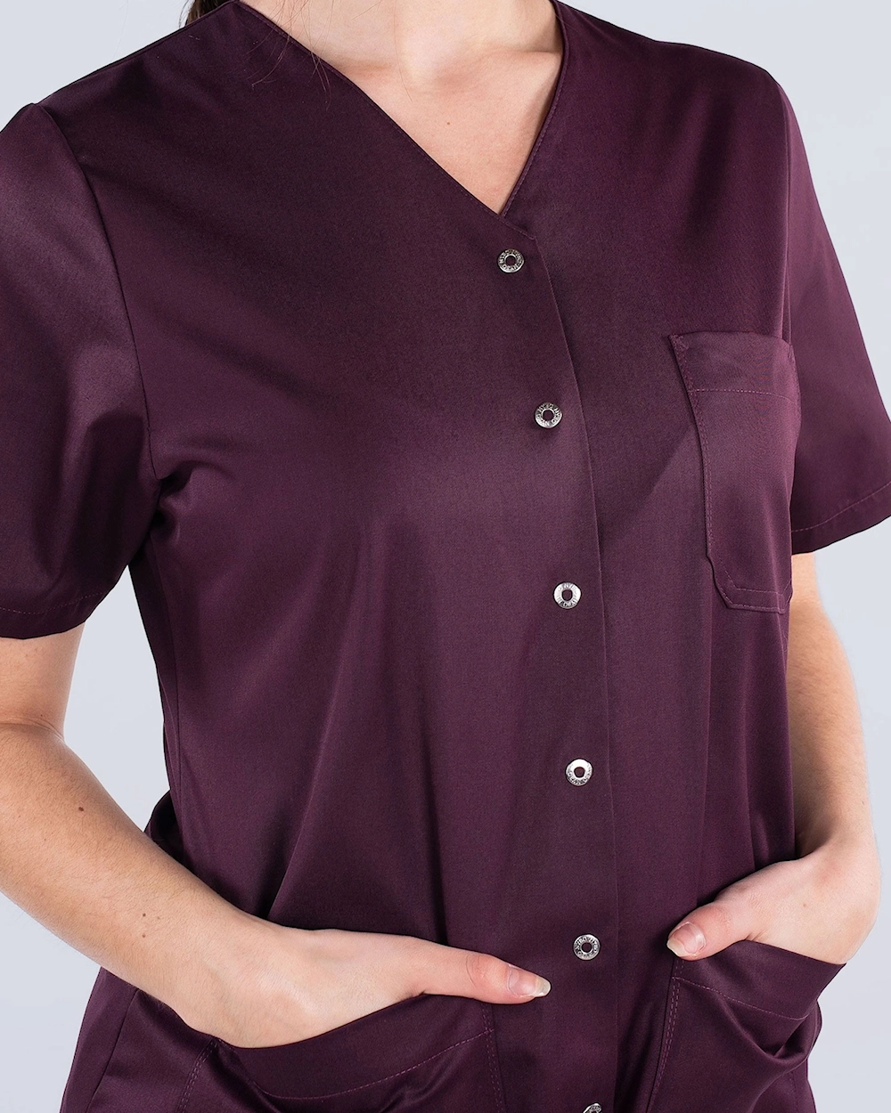 Hoitotunika, jossa käytännölliset painonapit ja koristeellinen v-pääntie. Tunika on kevyesti kavennettu mukavan istuvuuden saavuttamiseksi. Sivuhalkioiden ansiosta saat runsaasti liikkumavaraa. Tilava rintatasku sekä lonkkataskut puhelintaskulla ja avaimenpidikkeellä tarjoavat runsaasti säilytysmahdollisuuksia.