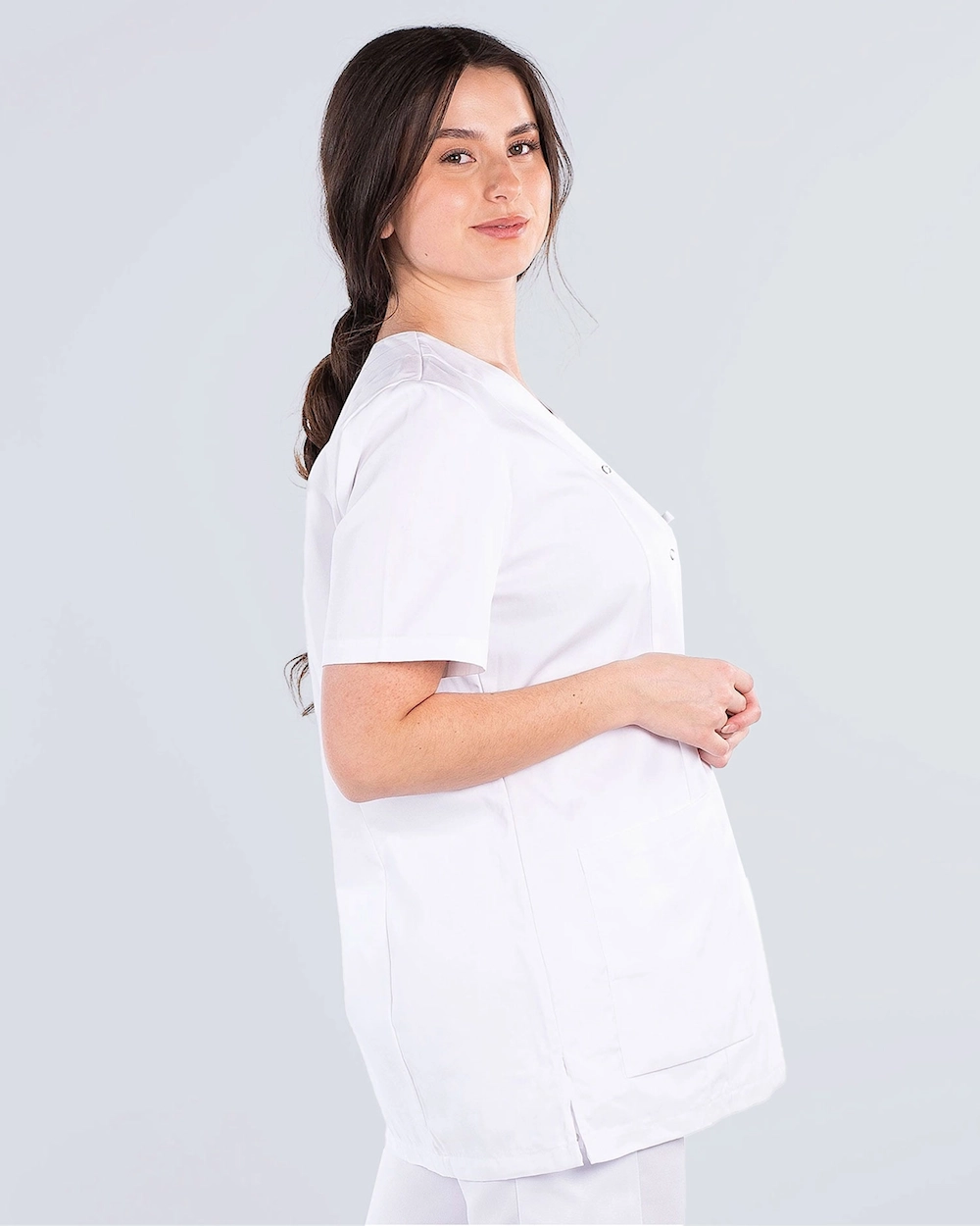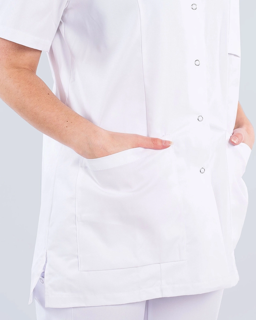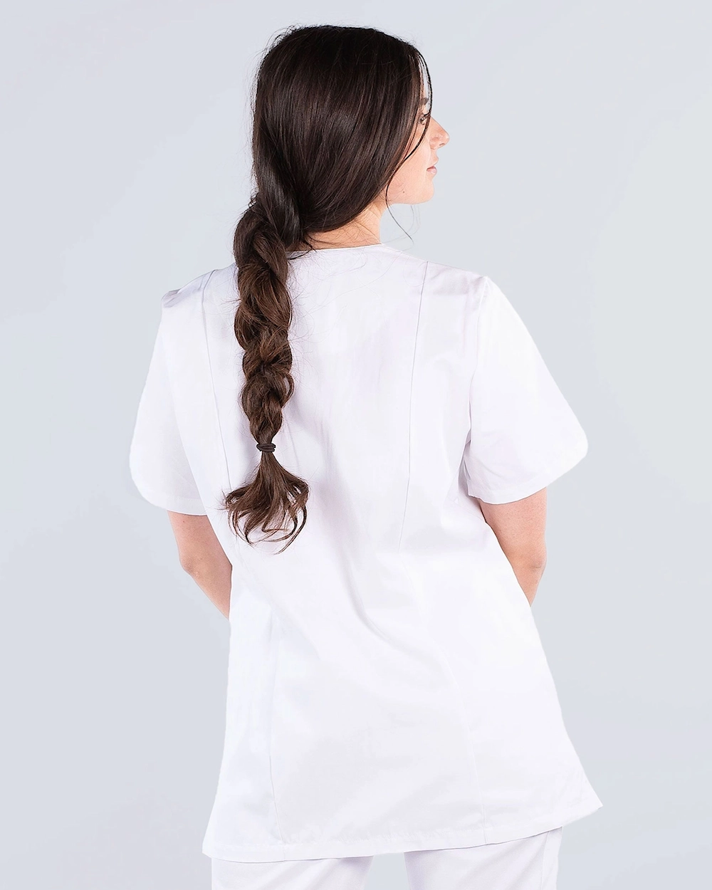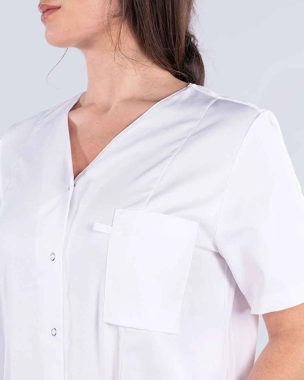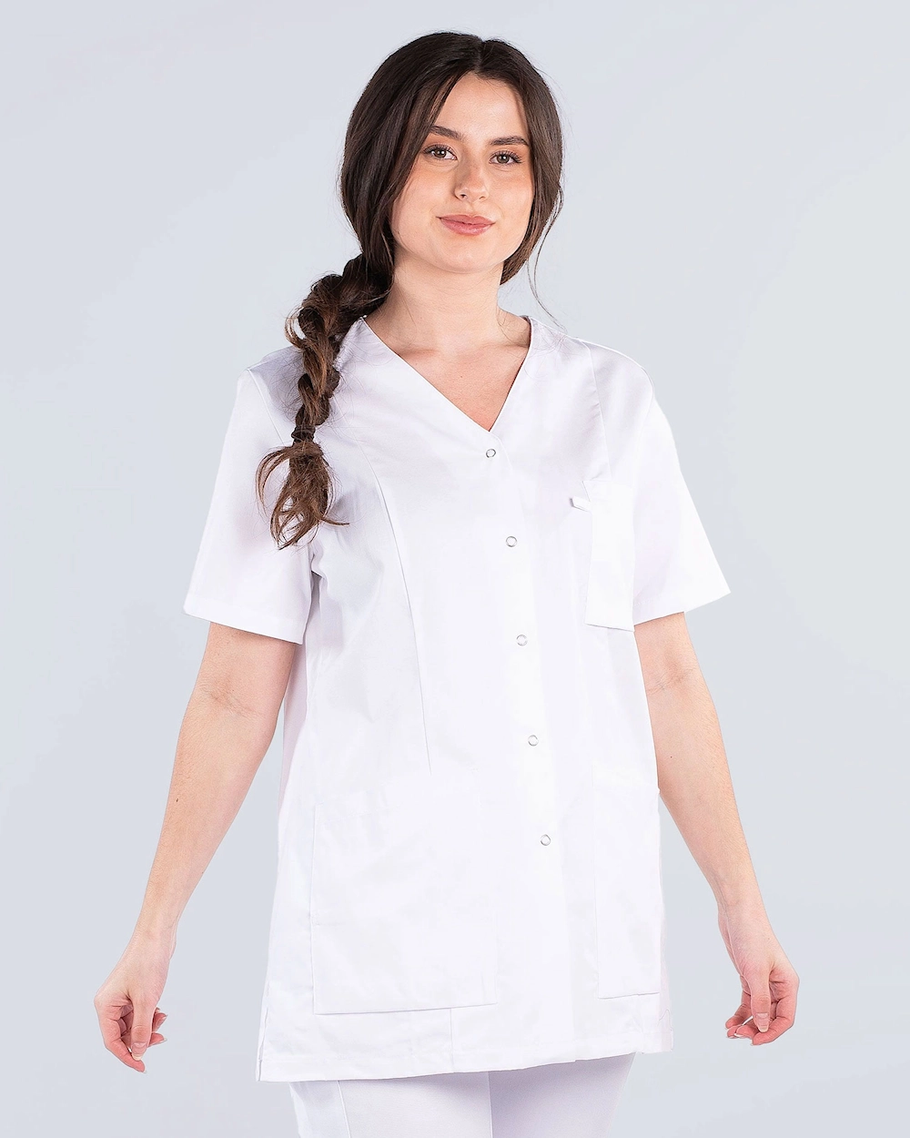 Klassinen a-linjamuotoinen hoitotunika. Tunikassa on hienot yksityiskohdat, kuten v-pääntie ja näkyvät painonapit. Runsaasti tilaa työvälineiden säilyttämiseen kahden tilavan lonkkataskun ansioista, joissa on sekä puhelintasku että avainlenkki. Rintataskussa on ulkoinen lenkki kynän tai henkilökortin kiinnittämiseen. Tunikassa on sivuhalkiot molemmin puolin mukavuuden ja runsaan liikkumavaran takaamiseksi.