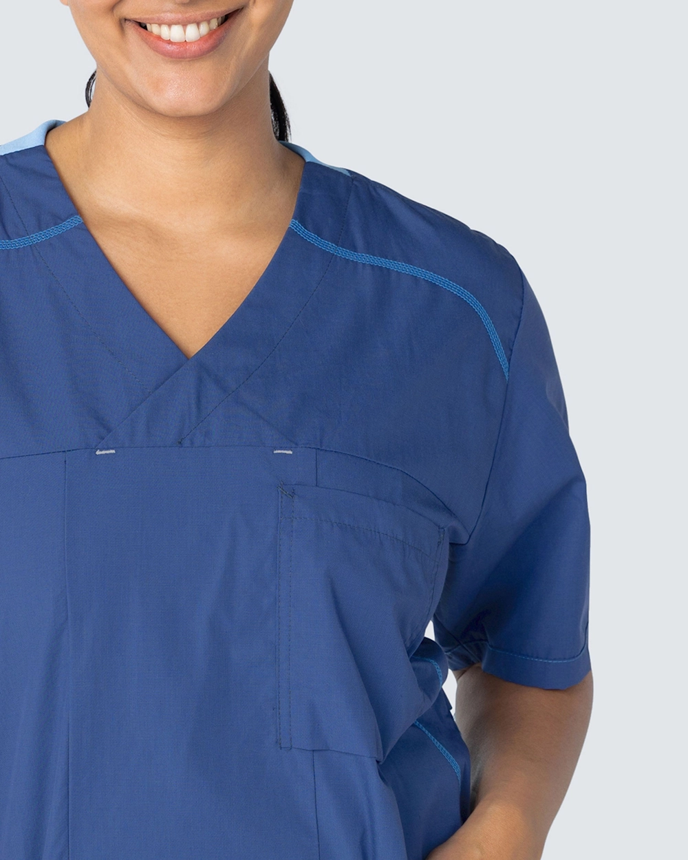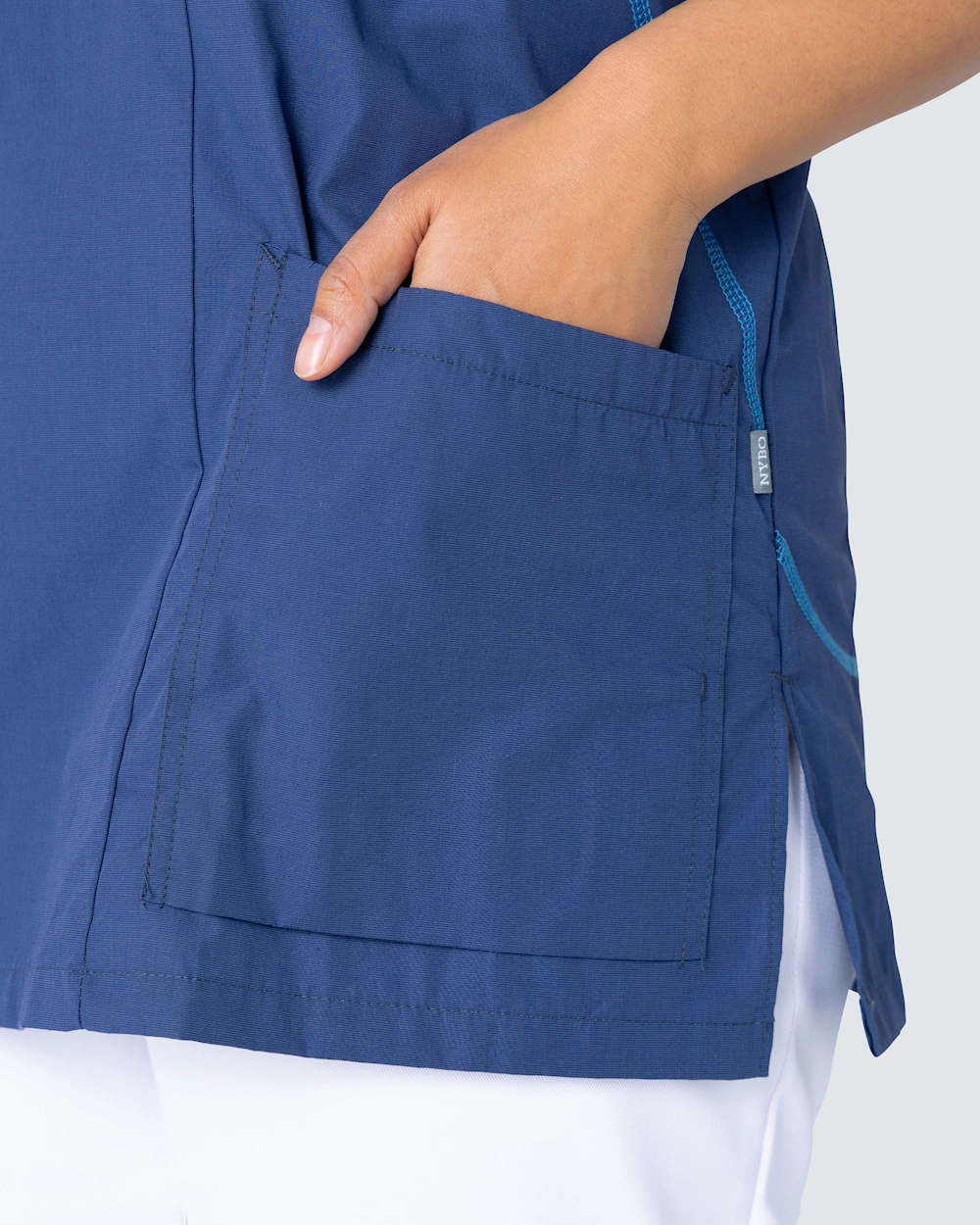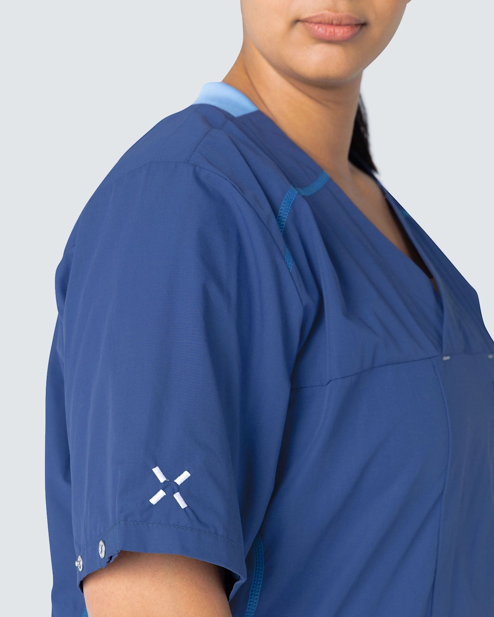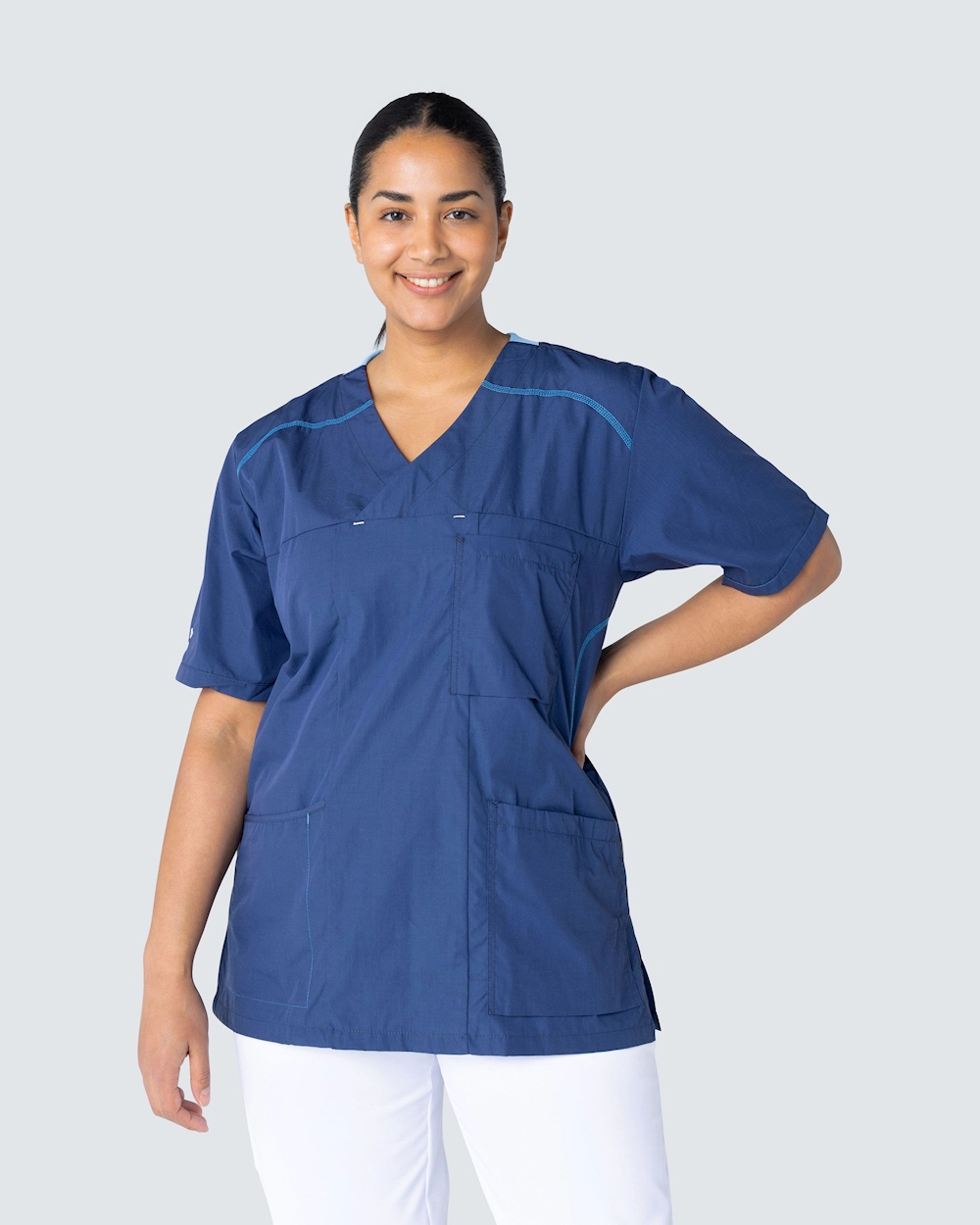 Sporty är en kollektion med vårdbussaronger, skjortor och västar inspirerad av moderna löpkläder. Plaggen är designade med en rymlig passform och med sportiga linjer i konstrastfärg som ger ett snyggt utseende. Plaggen i kollektionen Sporty finns i sex stilrena färger och kan tvättas i 75°C.