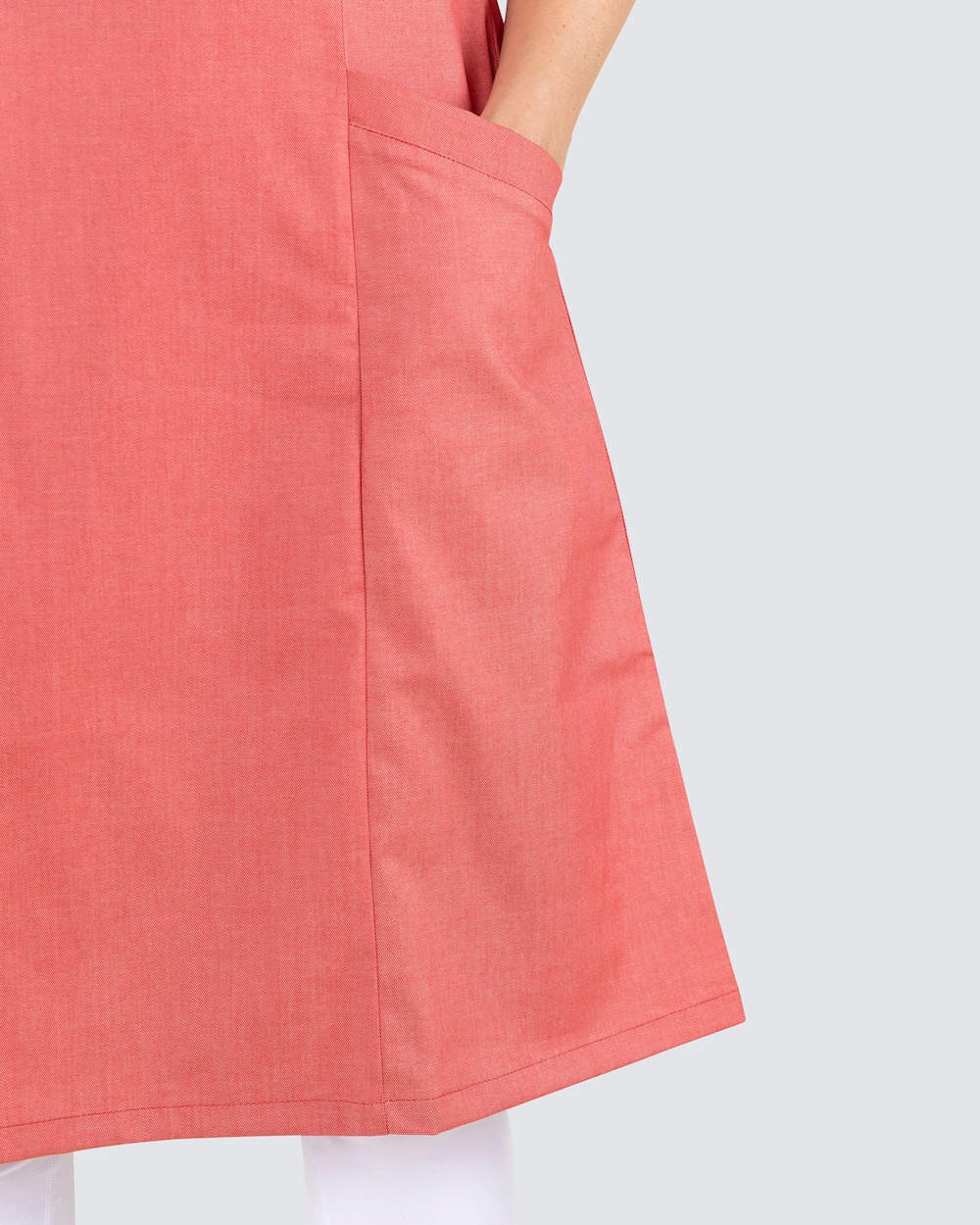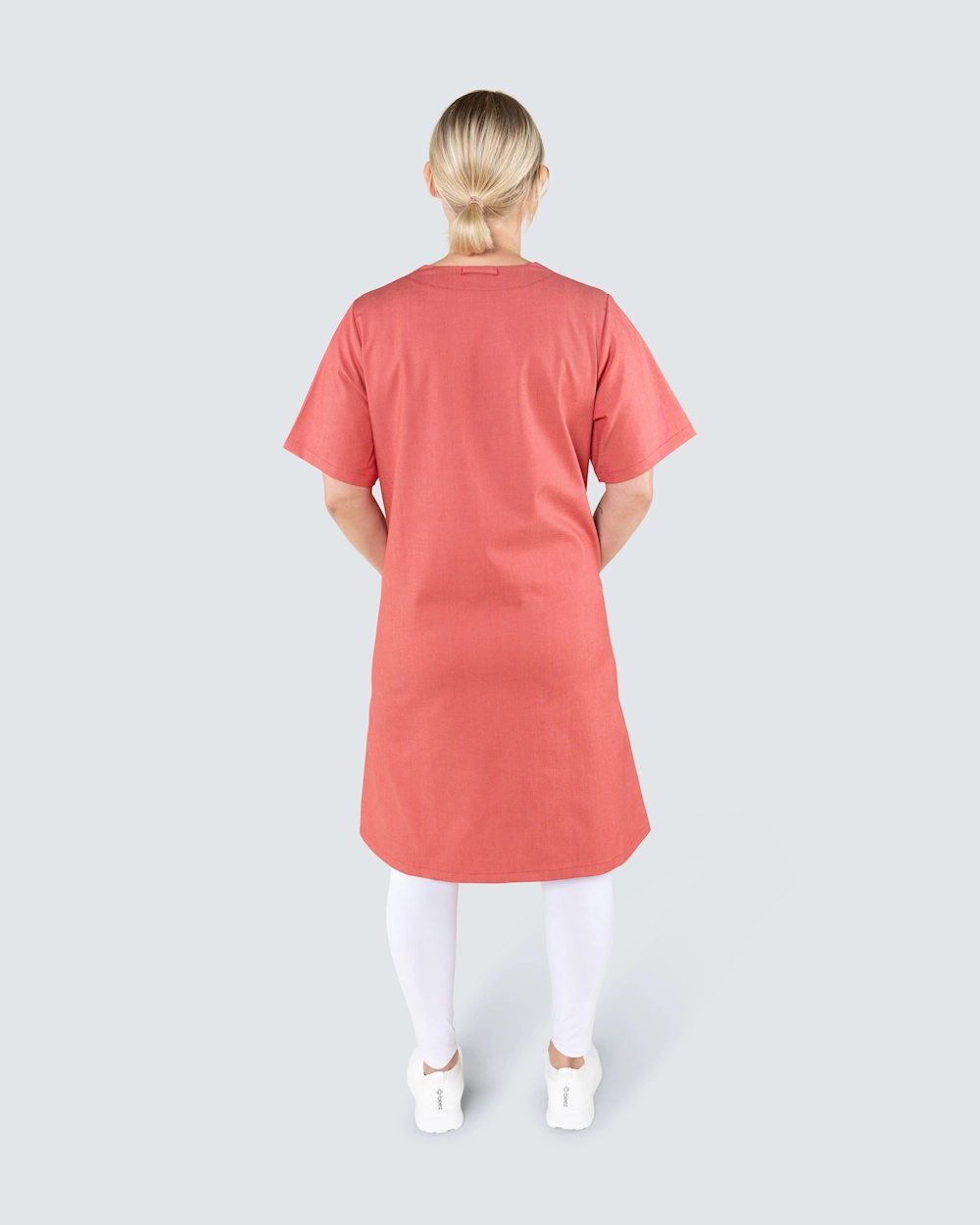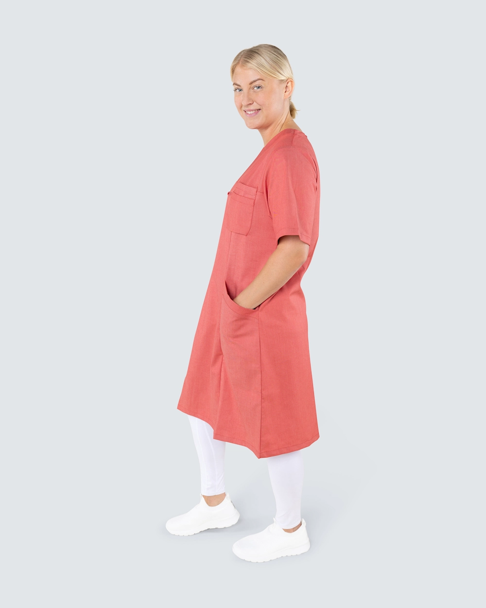Tämä mekko on valmistettu XLA stretch-materiaalista, mikä antaa mukavan ja joustavan vaatteen. Mekko on a-linjamuotoinen mukavan istuvuuden takaamiseksi. Mekossa on kaksi sivutaskua sekä yksi rintatasku, jossa runsaasti tilaa työvälineille, kynille ja muistilehtiöille.
