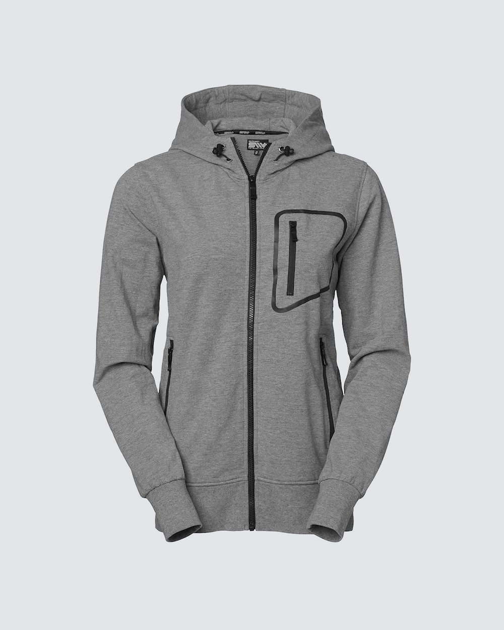 Naisten collegetakki joustavasta neuletrikoosta, jonka sivutaskuissa ja rintataskussa tehostevärinen vetoketju ja ketjussa logovetimet. Hupussa korkea kaulanosuus sekä nyöri, jonka avulla voi säätää hupun etureunaa.