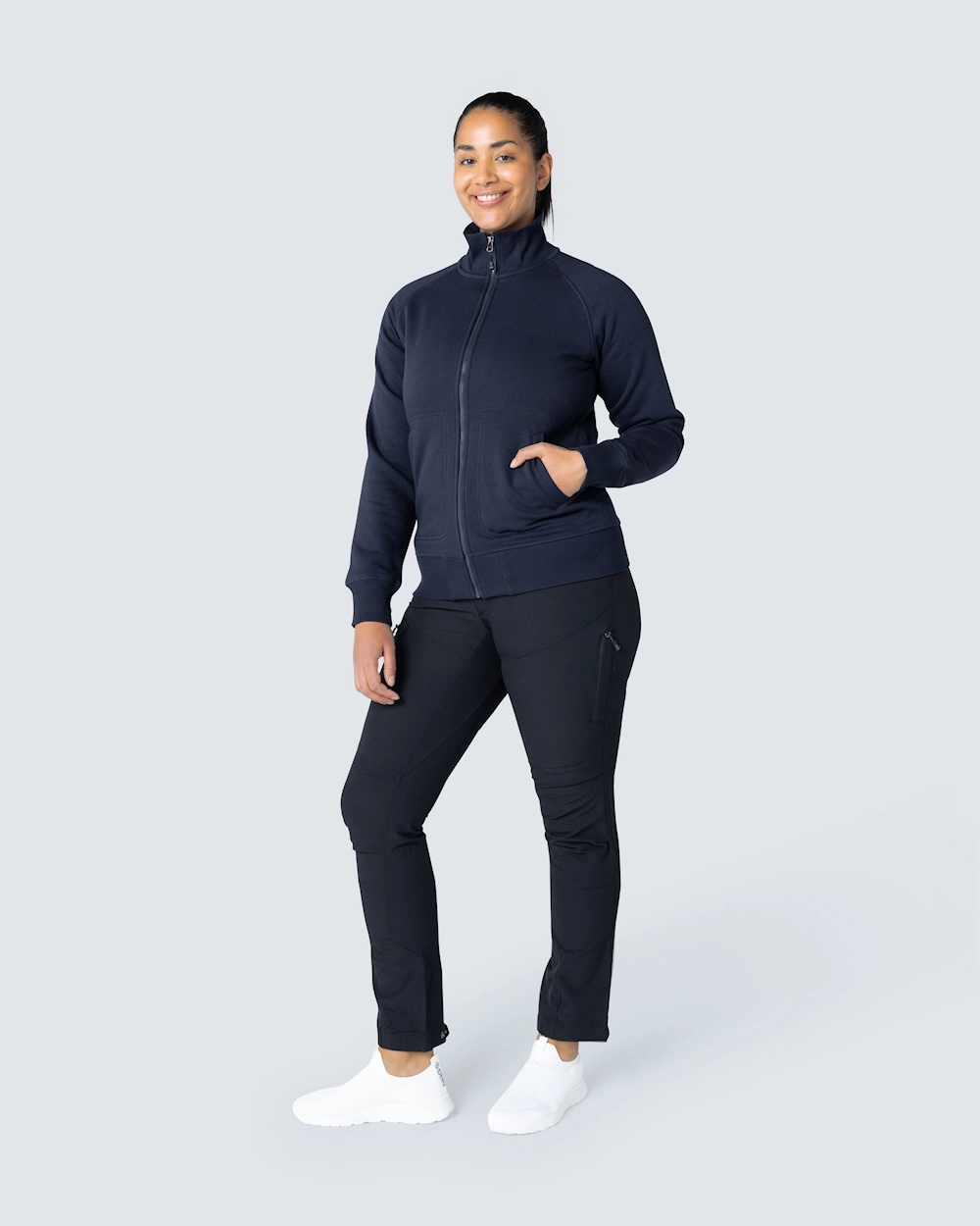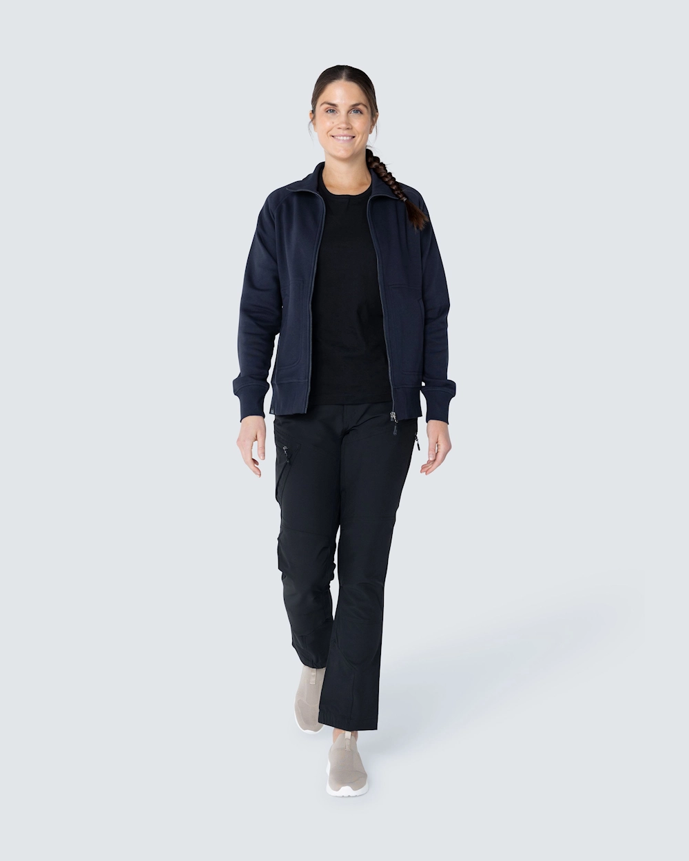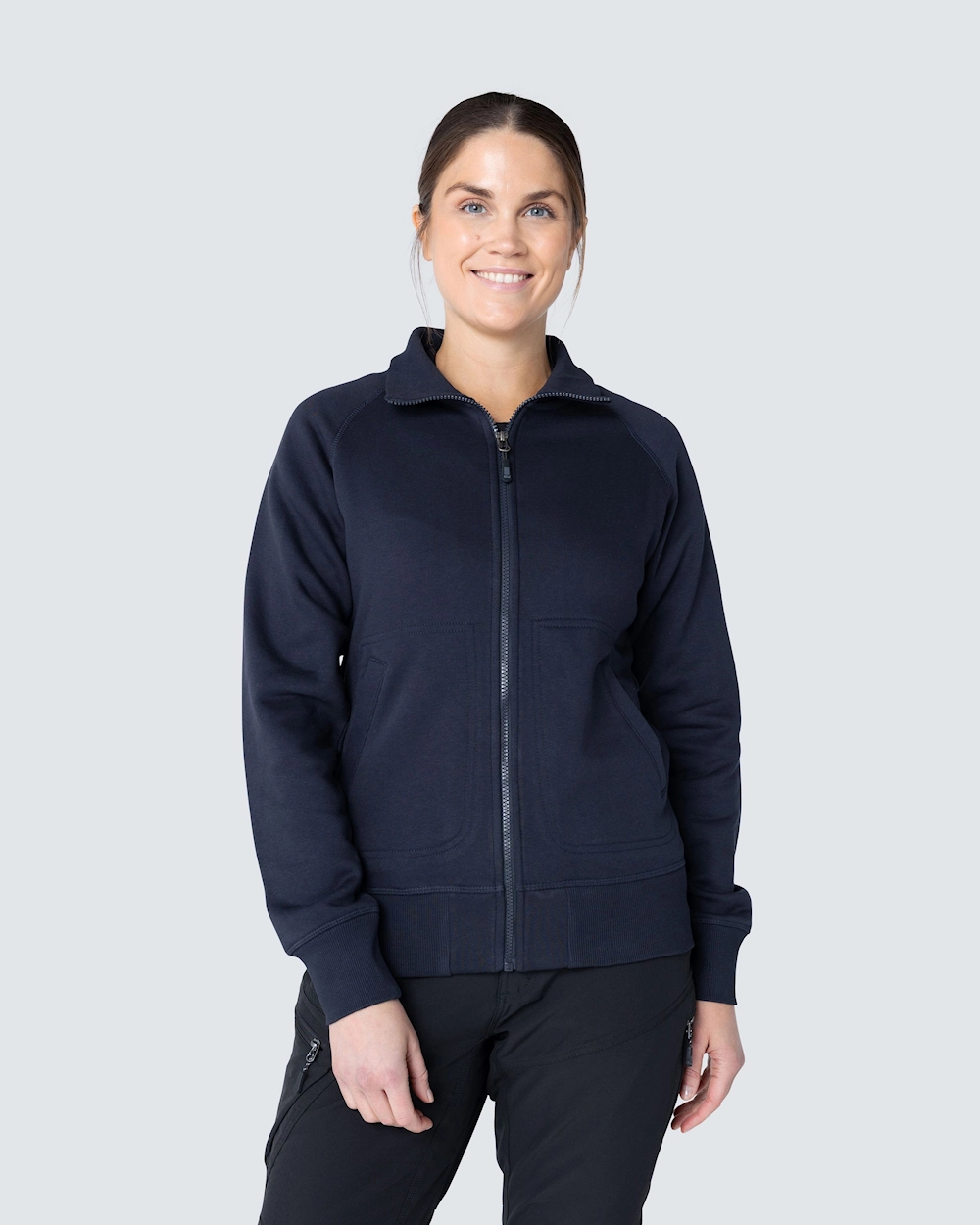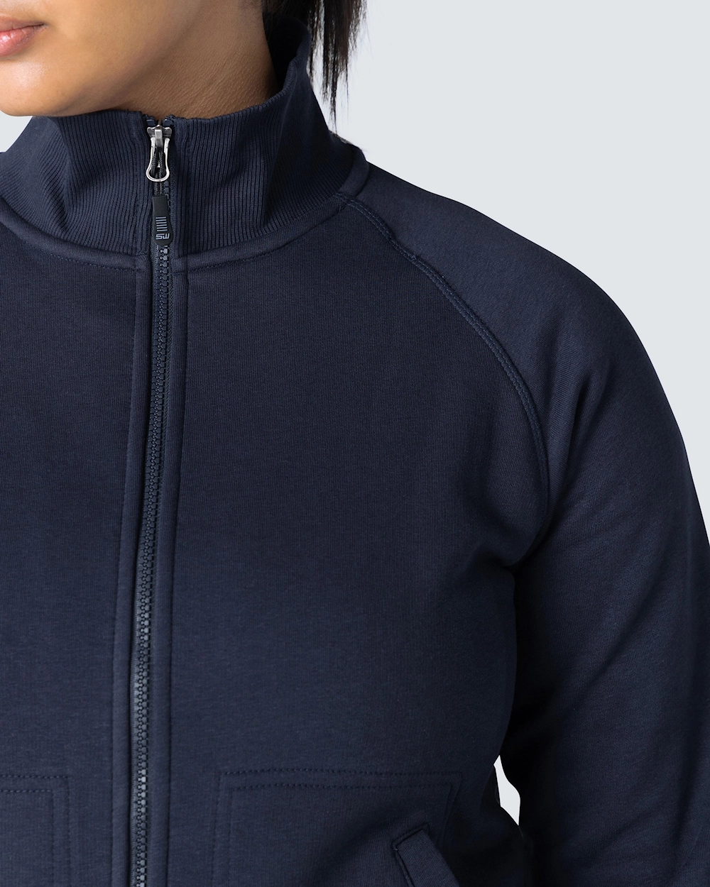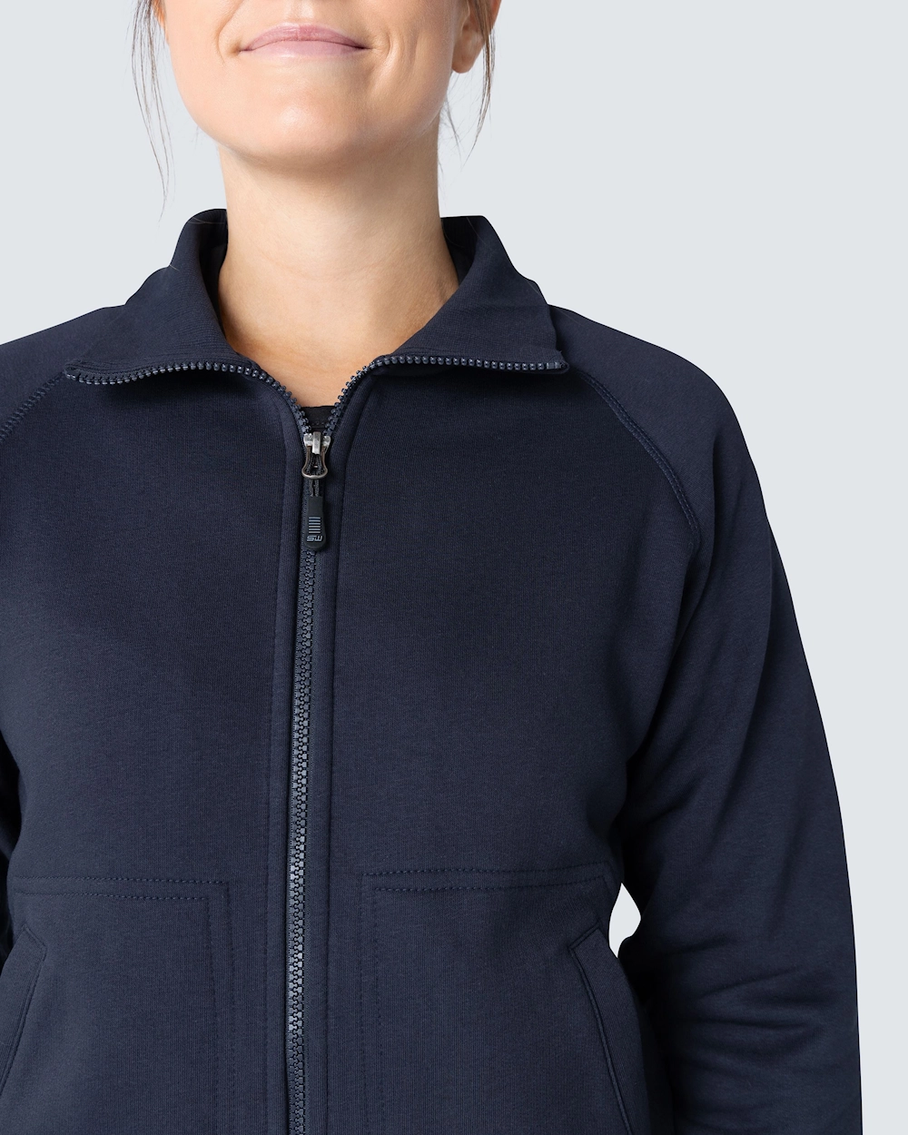 Muotoiltu naisten collegetakki vetoketjulla. Harjattu sisäosa ja raglanhihat. Elastinen resori kauluksessa, hihansuissa ja helmassa. Koristeompeleet etutaskujen ympärillä.