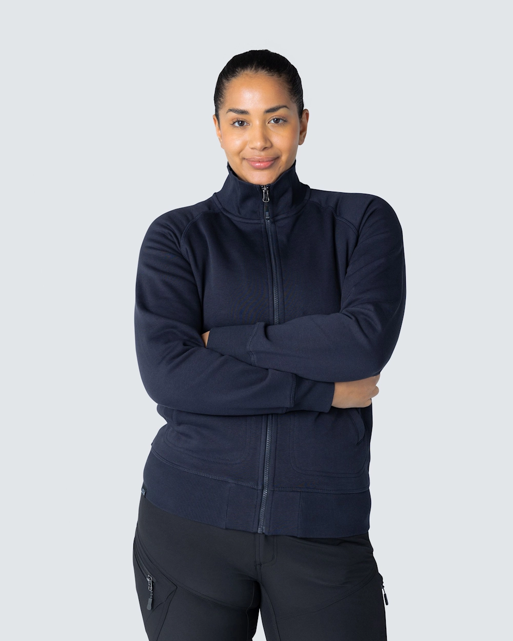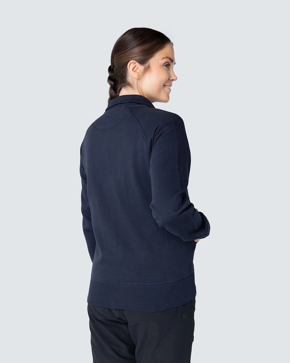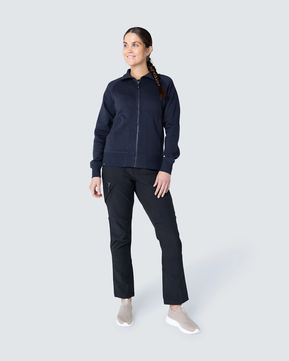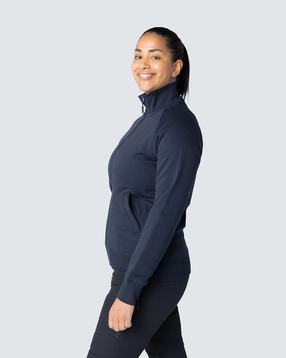 Muotoiltu naisten collegetakki vetoketjulla. Harjattu sisäosa ja raglanhihat. Elastinen resori kauluksessa, hihansuissa ja helmassa. Koristeompeleet etutaskujen ympärillä.