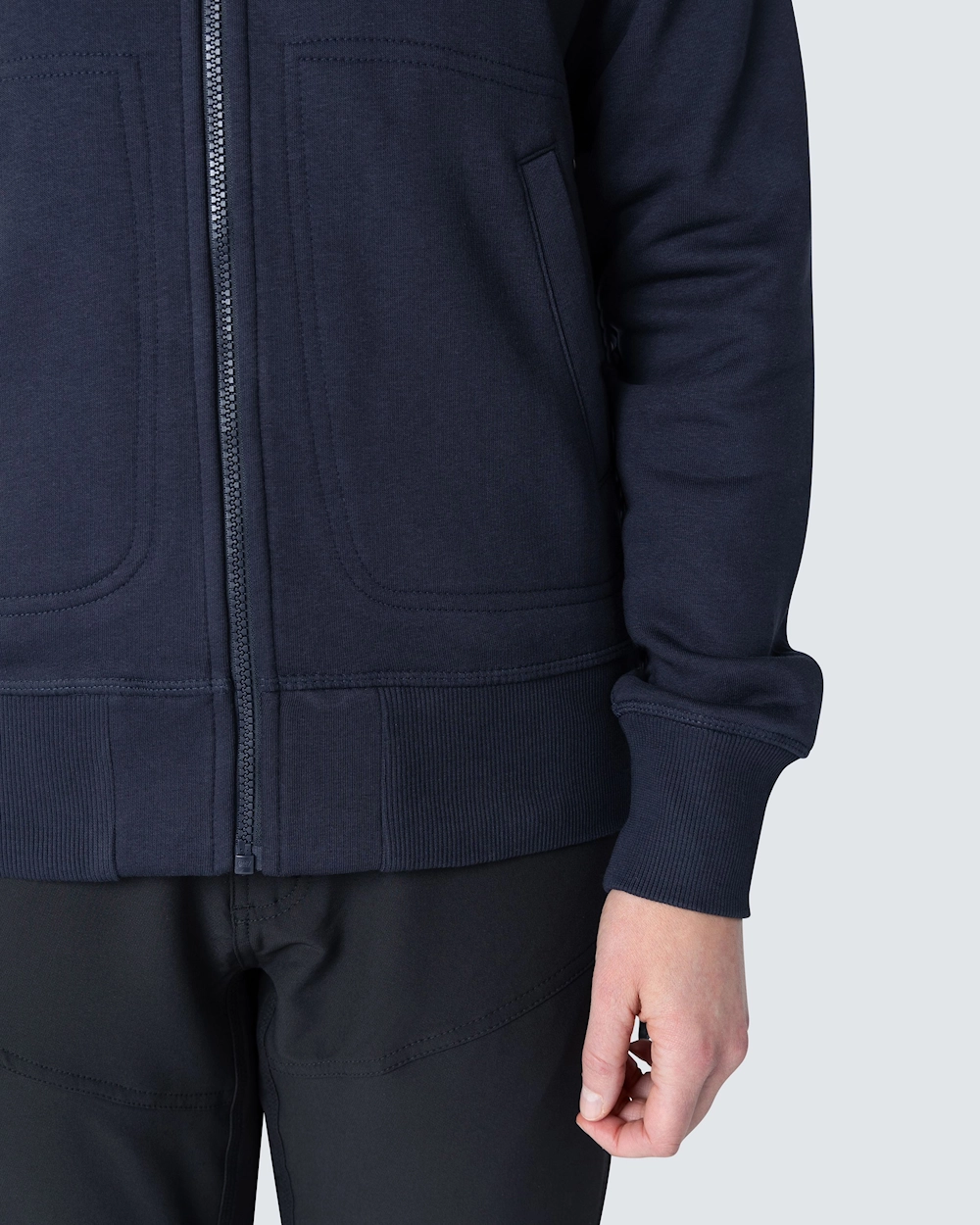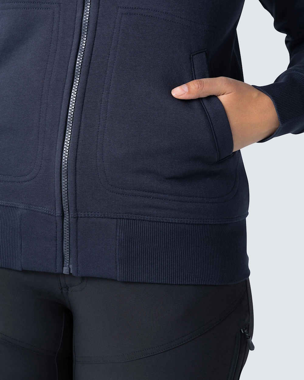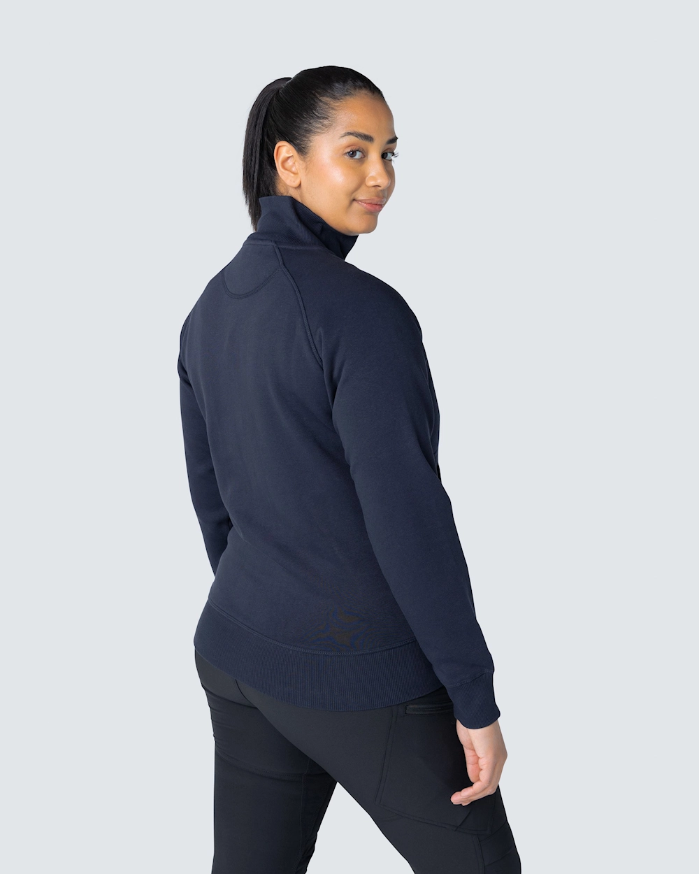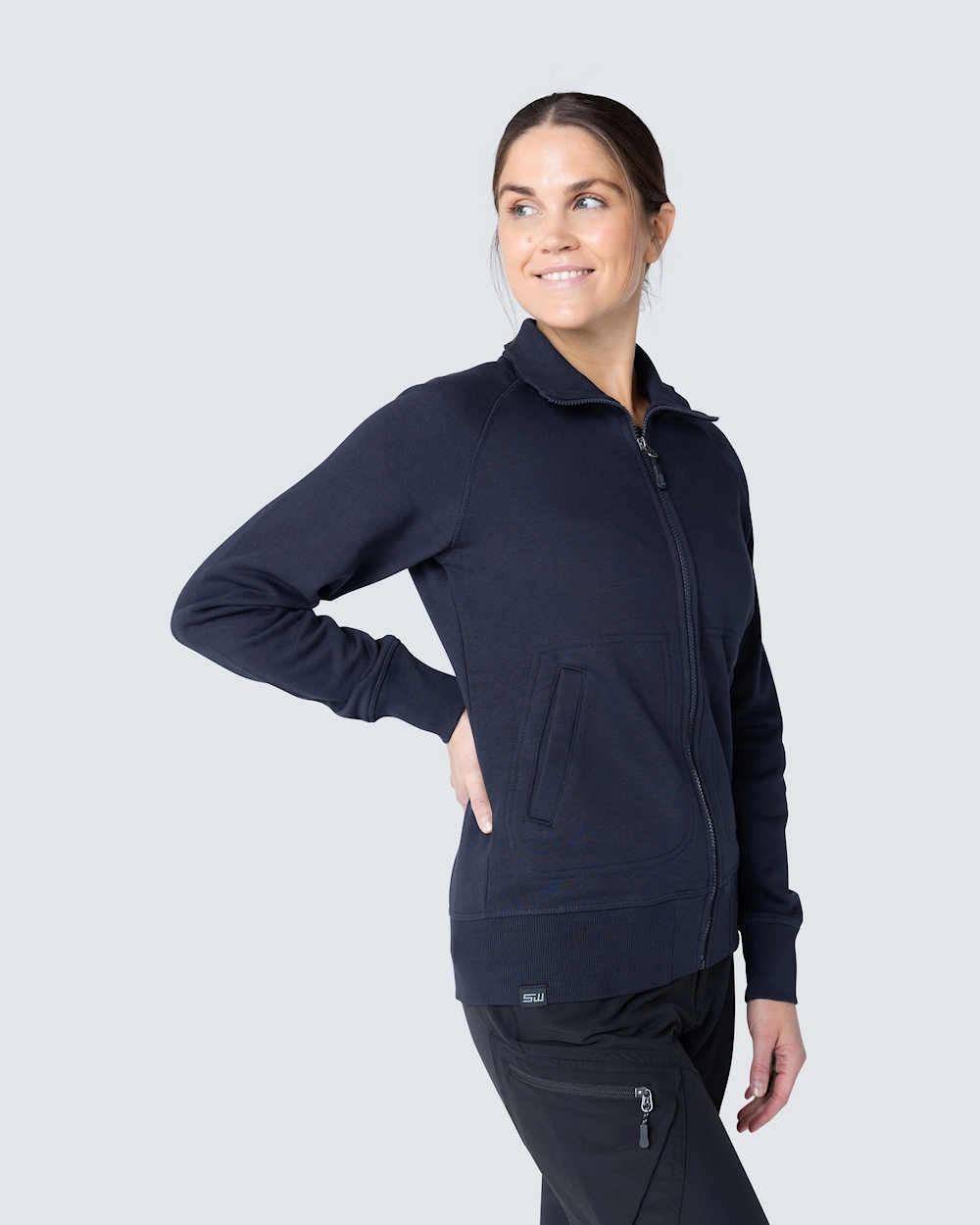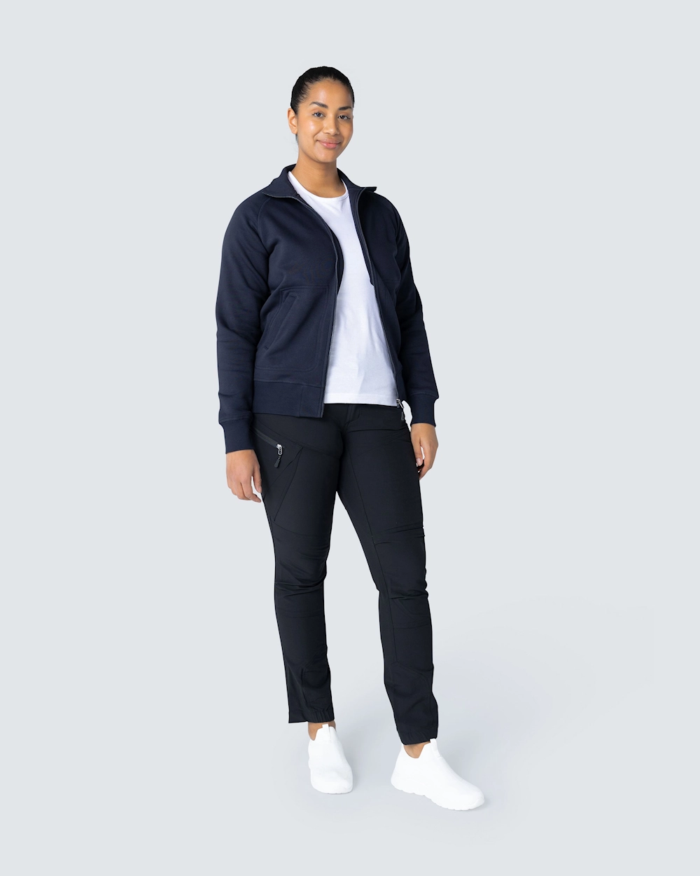Muotoiltu naisten collegetakki vetoketjulla. Harjattu sisäosa ja raglanhihat. Elastinen resori kauluksessa, hihansuissa ja helmassa. Koristeompeleet etutaskujen ympärillä.