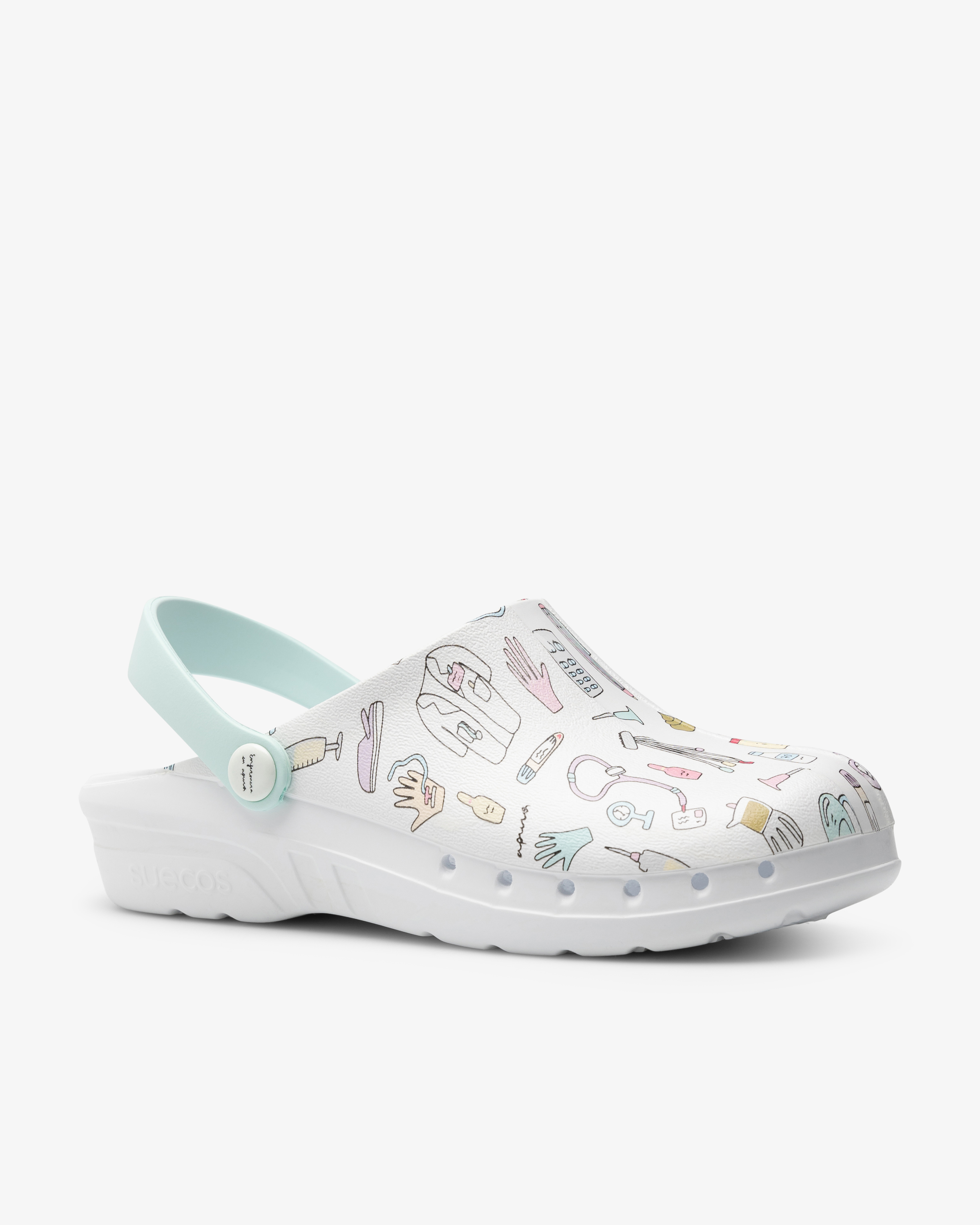 Kevyt, joustava ja ergonomisesti muotoiltu, kestävästä kumiseoksesta valmistettu puukenkä, joka tarjoaa optimaalisen mukavuuden ja toiminnallisuuden pitkinä päivinä terveydenhuollon työssä. Pohja vaimentaa mukavasti iskuja ja lievittää jalkoihin, polviin ja selkään kohdistuvaa painetta. Vedenpitävät, liukastumista kestävät ja hengittävät kengät. Vakauttava kantapäähihna, joka voidaan taittaa eteenpäin, kun sitä ei tarvita. Tällä puukengällä on antibakteerisia ominaisuuksia, ja se on helppo puhdistaa saippualla ja vedellä. Kengät voidaan steriloida ultraviolettisäteillä, gammasäteillä ja vetyperoksidilla.