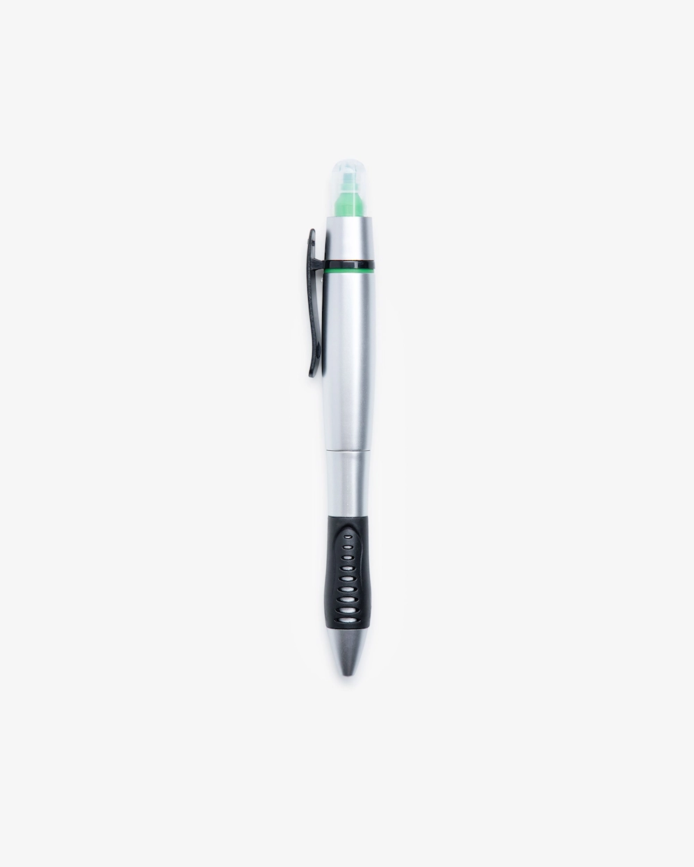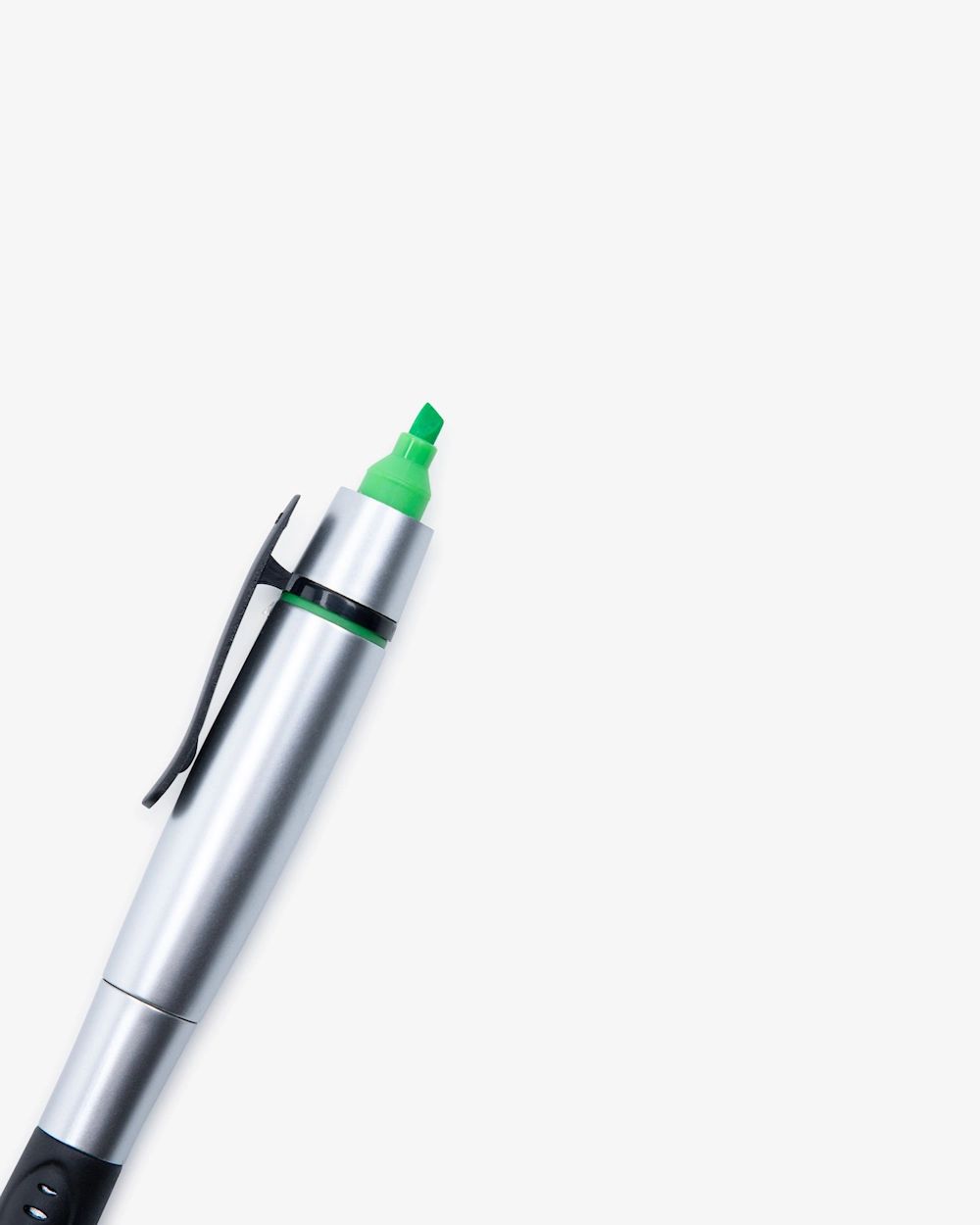 Käytännöllinen 2-in-1 kynä. Toisessa päässä on mustaa mustetta ja korostuskynän päässä limen vihreä väri.